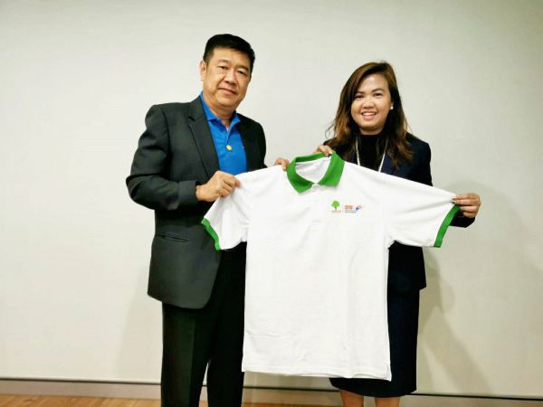 มอบเสื้อเครือข่ายสื่อมวลชนไทยใส่ใจทางเลือกใหม่พลังงานไฟฟ้าให้กับนายกิตติพงษ์ ภิญโญตระกูล (ซ้าย) รองเลขาธิการ สำนักงานคณะ...