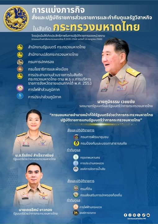 กรุงเทพฯ-การแบ่งภารกิจสั่งและปฏิบัติราชการส่วนราชการและกำกับดูแลรัฐวิสาหกิจในสังกัดกระทรวงมหาดไทยของ รมว.มท. และ รมช.มท....
