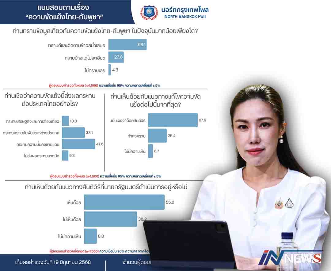 กรุงเทพฯ-ผลโพลชี้ปชช.ส่วนใหญ่หนุนสันติวิธี 67.9% ต้องการเห็นการเจรจาแก้ปัญหาไทย–กัมพูชา ไม่ใช่สงคราม พร้อมเห็นด้วย...