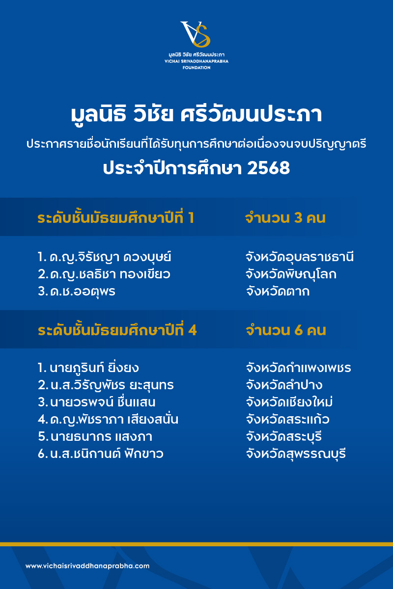 มูลนิธิวิชัย ศรีวัฒนประภาประกาศรายชื่อ ผู้ได้รับทุนการศึกษารุ่นที่6ปี2568