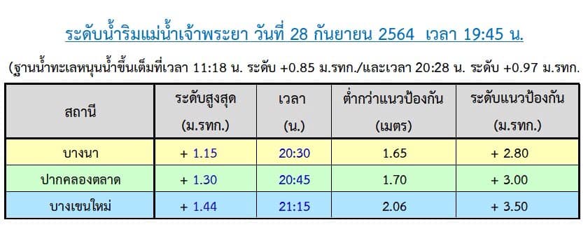 (29 ก.ย. 64) พล.ต.อ.อัศวิน ขวัญเมือง ผู้ว่าราชการกรุงเทพมหานคร เปิดเผยถึงสถานการณ์น้ำเหนือไหลผ่านเขื่อนเจ้าพระยา ว่า วันนี้(06.00 น.) ปริมาณน้ำของกรมชลประทานที่อำเภอบางไทรตรวจวัดปริมาณน้ำไหลผ่านกทม. เฉลี่ย 2,561 ลูกบาศก์เมตรต่อวินาที ระดับน้ำในแม่น้ำเจ้าพระยาบริเวณปากคลองตลาดของ กทม. อยู่ที่ระดับ 1.50 เมตร จากระดับน้ำทะเลปานกลาง ซึ่งยังต่ำกว่าระดับคันกั้นน้ำแม่น้ำเจ้าพระยาของกรุงเทพมหานครอยู่ประมาณ 1.50 เมตร จึงยังไม่ส่งผลกระทบในพื้นที่ กทม. สำหรับระดับน้ำแนวคันกั้นน้ำด้านตะวันออก ณ ประตูระบายน้ำคลองสอง (สายใต้) อยู่ในระดับปกติ +1.31 (ระดับวิกฤติ +1.80) ประตูระบายน้ำแสนแสบ (มีนบุรี) อยู่ในระดับปกติ +0.68 (ระดับวิกฤติ +0.90) ประตูระบายน้ำลาดกระบัง อยู่ในระดับปกติ +0.26 (ระดับวิกฤติ +0.60) โดยวันนี้ฐานน้ำในแม่น้ำเจ้าพระยาจะขึ้นสูงสุดเวลา 20.25 น. ที่ระดับ +0.97 ม.รทก.