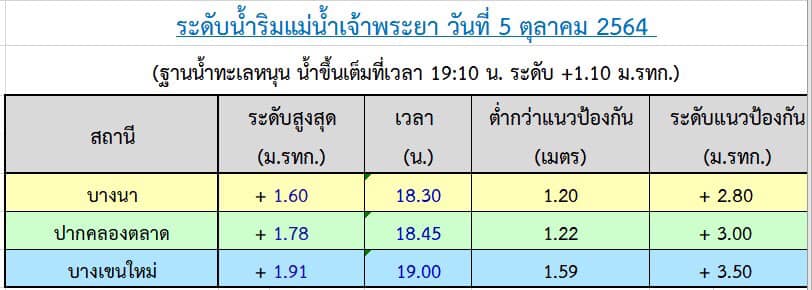(6 ต.ค. 64) พล.ต.อ.อัศวิน ขวัญเมือง ผู้ว่าราชการกรุงเทพมหานคร เปิดเผยถึงสถานการณ์น้ำเหนือไหลผ่านเขื่อนเจ้าพระยา ว่า วันนี้ (เวลา 06.00 น.) ปริมาณน้ำของกรมชลประทานที่อำเภอบางไทรตรวจวัดปริมาณน้ำไหลผ่านกทม. เฉลี่ย 3,104 ลูกบาศก์เมตรต่อวินาที ระดับน้ำในแม่น้ำเจ้าพระยาบริเวณปากคลองตลาดของ กทม. อยู่ที่ระดับ 1.78 เมตร จากระดับน้ำทะเลปานกลาง ซึ่งยังต่ำกว่าระดับคันกั้นน้ำแม่น้ำเจ้าพระยาของกรุงเทพมหานครอยู่ประมาณ 1.22 เมตร จึงยังไม่ส่งผลกระทบในพื้นที่ กทม.