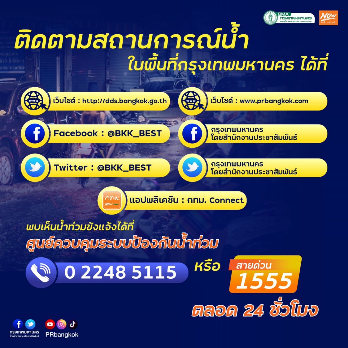 5.ด้านการประชาสัมพันธ์ การรายงานสถานการณ์ฝนในพื้นที่กรุงเทพฯ เพื่อให้ประชาชนทราบข้อมูลแบบเรียลไทม์ โดยผ่านช่องทาง ที่ http://dds.bangkok.go.th/ ,www.prbangkok.com ,Facebook:@BKK_BEST, สำนักงานประชาสัมพันธ์ Twitter:@BKK_BEST, สำนักงานประชาสัมพันธ์และแอปพลิเคชัน กทม. Connect หรือแจ้งปัญหาความเดือดร้อนจากปัญหาน้ำท่วมได้ที่ ศูนย์ควบคุมระบบป้องกันน้ำท่วม โทร.022485115 และสายด่วน 1555 ตลอด 24 ชั่วโมง