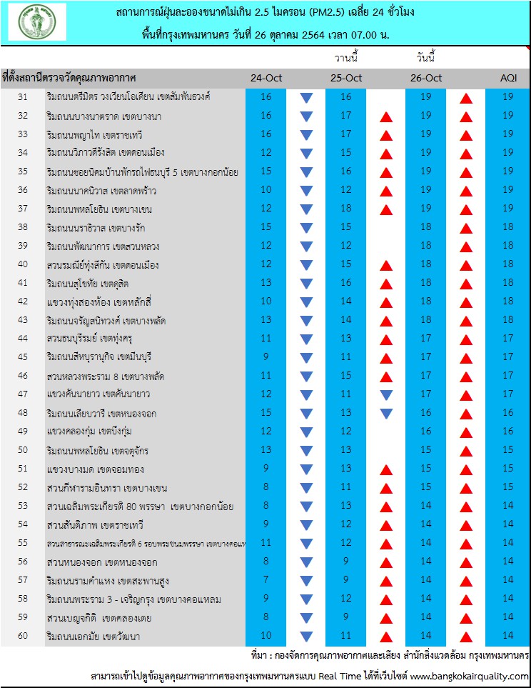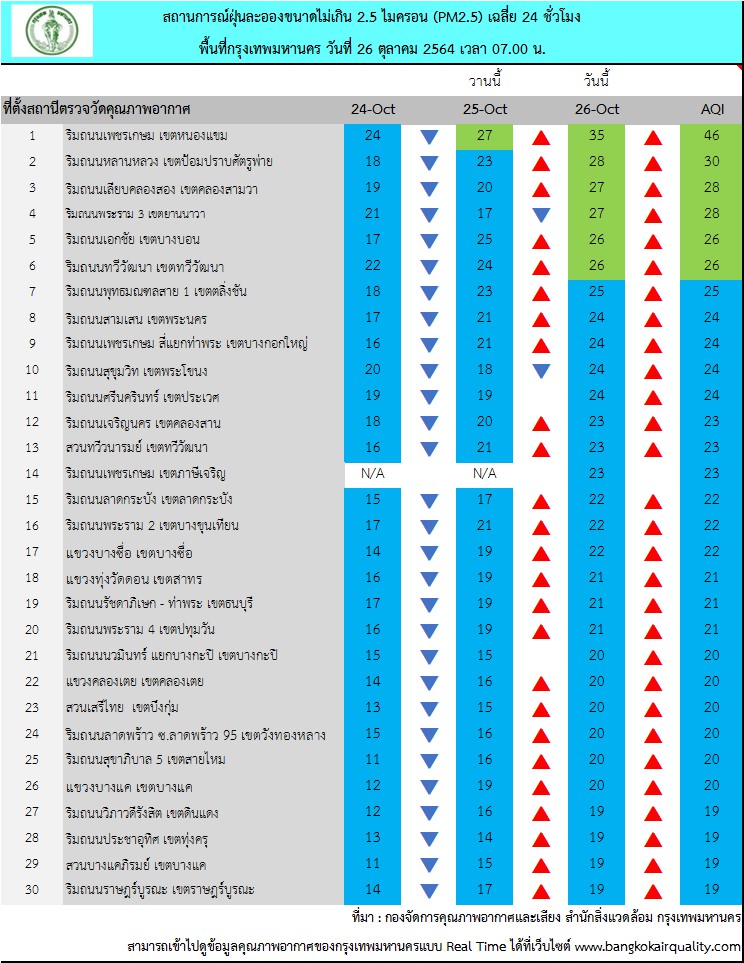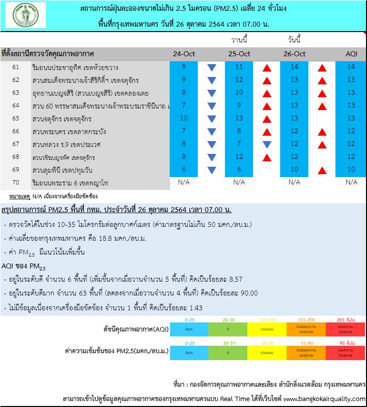 กรุงเทพฯ-ศูนย์ประสานงานและแก้ไขปัญหามลพิษทางอากาศในกรุงเทพมหานครขอรายงานสถานการณ์ฝุ่นละอองขนาดไม่เกิน 2.5 ไมครอน (PM 2.5) ของสถานีตรวจวัดคุณภาพอากาศของกรุงเทพมหานคร ???? ประจำวันอังคารที่ 26 ตุลาคม พ.ศ. 2564 เวลา 07.00 น. ค่าเฉลี่ย 24 ชั่วโมง ของฝุ่นละอองขนาดไม่เกิน 2.5 ไมครอน (PM2.5)