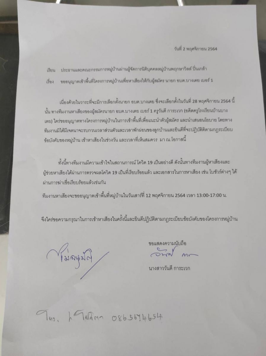 นางสาวพรทิพย์ ผู้จัดการนิติบุคคลฯ เปิดเผยว่า เมื่อวันที่ 2/11/64 ประมาณ 10 .00 น. ผู้อ้างทีมงานผู้สมัครนายก อบต. บางเตย ได้เข้ามายื่นเอกสาร พร้อมด้วยแผ่นพับ เพื่อขออนุญาตเข้ามาหาเสียงในหมู่บ้าน และติดตั้งป้ายหาเสียงในหมู่บ้าน ทางตนเองก็ได้รับเอกสารไว้แล้วแจ้งว่าจะต้องขออนุญาตคณะกรรมการหมู่บ้านก่อน แล้วจะแจ้งกลับให้ทราบว่ากรรมการหมู่บ้านจะอนุญาตหรือไม่ก่อน