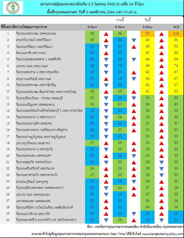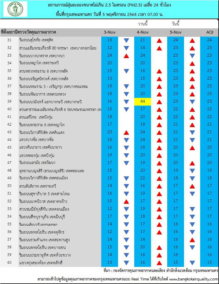 : ประจำวันศุกร์ที่ 5 พฤศจิกายน พ.ศ. 2564 เวลา 07.00 น. ค่าเฉลี่ย 24 ชั่วโมง ของฝุ่นละอองขนาดไม่เกิน 2.5 ไมครอน (PM2.5)