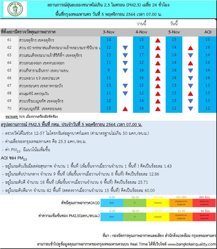 ศูนย์ประสานงานและแก้ไขปัญหามลพิษทางอากาศในกรุงเทพมหานครขอรายงานสถานการณ์ฝุ่นละอองขนาดไม่เกิน 2.5 ไมครอน (PM 2.5) ของสถานีตรวจวัดคุณภาพอากาศของกรุงเทพมหานคร