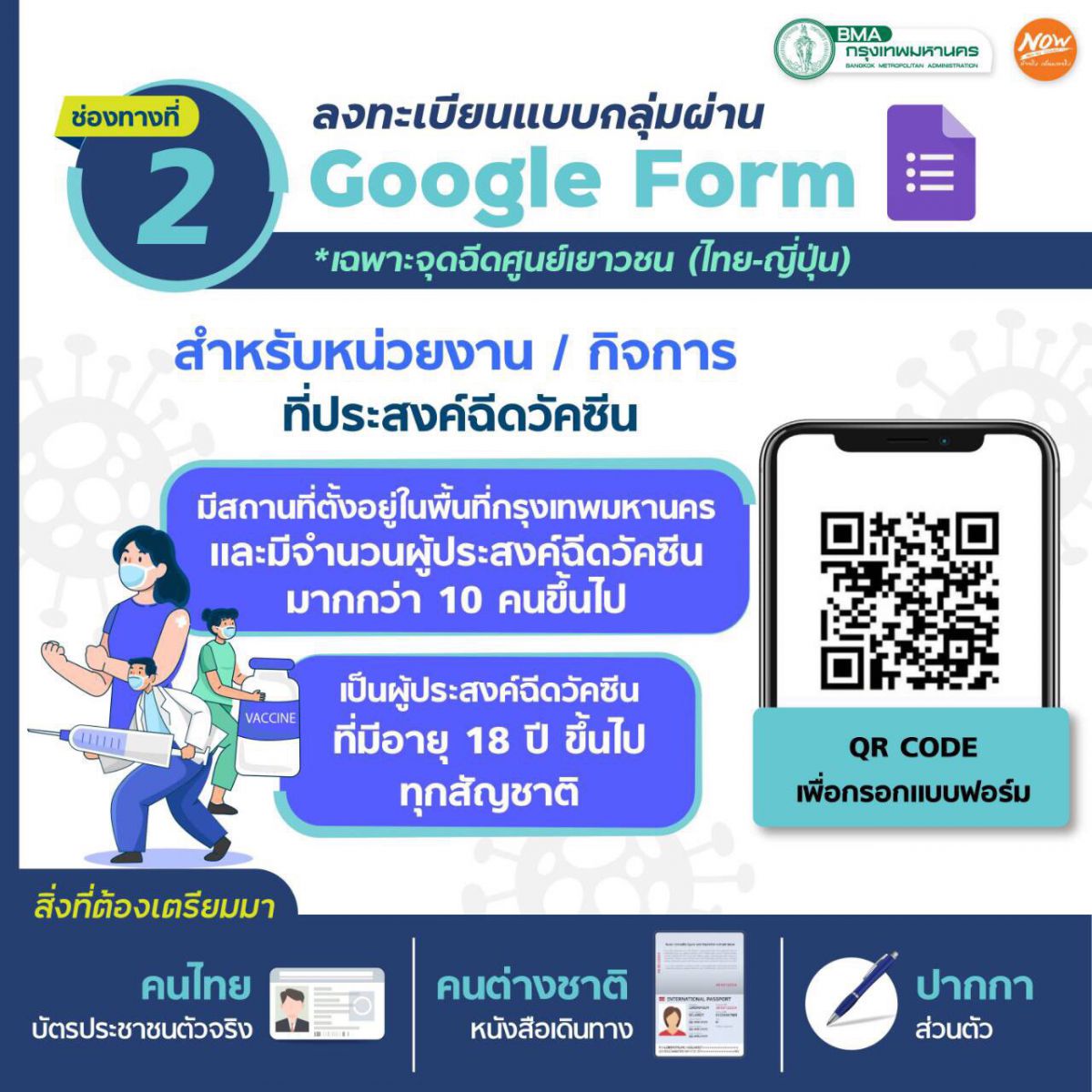 สำหรับช่องทางการรับวัคซีนมี 3 ช่องทาง ได้แก่ ช่องทางที่ 1 สำหรับประชาชนทั่วไป สามารถนัดหมายขอรับวัคซีนได้ทางแอปพลิเคชัน “QueQ” โดยมีขั้นตอนการลงทะเบียน ดังนี้ 1. สแกนคิวอาร์โค้ด (QR Code) เพื่อดาวน์โหลดแอปพลิเคชัน “QueQ” 2. เข้าแอปพลิเคชัน “QueQ” เลือก “ศูนย์ฉีดวัคซีน กทม.” 3. เลือกสถานที่เข้ารับบริการ ได้แก่ ที่ประสงค์เข้ารับวัคซีน “กรุงเทพฯ เมืองยิ้ม ปลอดโรคโควิด19 อาคารกีฬาเวสน์ 2 ศูนย์เยาวชนกรุงเทพมหานคร (ไทย-ญี่ปุ่น) ดินแดง” หรือเลือกรับวัคซีน ที่โรงพยาบาลสังกัดกรุงเทพมหานคร 11 แห่ง ที่อยู่ใกล้บ้าน ได้แก่ โรงพยาบาลกลาง โรงพยาบาลตากสิน โรงพยาบาลเจริญกรุงประชารักษ์ โรงพยาบาลหลวงพ่อทวีศักดิ์ ชุตินฺธโร อุทิศ โรงพยาบาลเวชการุณย์รัศมิ์ โรงพยาบาลลาดกระบังกรุงเทพมหานคร โรงพยาบาลราชพิพัฒน์ โรงพยาบาลสิรินธร โรงพยาบาลผู้สูงอายุบางขุนเทียน โรงพยาบาลคลองสามวา และโรงพยาบาลบางนากรุงเทพมหานคร 4. กรอกเลขบัตรประชาชน/เลขหนังสือเดินทาง กดต่อไป และ 5. เลือกวันที่รับบริการ และเวลาที่ต้องการ กดยืนยัน ช่องทางที่ 2 เป็นการลงทะเบียนนัดหมายขอรับวัคซีนแบบองค์กรหรือกลุ่ม (Group vaccination) ที่มีจำนวนตั้งแต่ 10 คนขึ้นไป (เฉพาะศูนย์ฉีดวัคซีนป้องกันโรคโควิด-19 กรุงเทพมหานคร ณ อาคารกีฬาเวสน์ 2 ศูนย์เยาวชนกรุงเทพมหานคร (ไทย-ญี่ปุ่น) เขตดินแดง) โดยสแกนคิวอาร์โค้ด (QR Code) เพื่อลงทะเบียนออนไลน์ผ่าน GOOGLE FORM เช่น กลุ่มพนักงานจากร้านหรือผู้ประกอบการขนาดเล็ก กลุ่มคนงาน จากแคมป์ก่อสร้าง เป็นต้น และช่องทางที่ 3 การลงทะเบียนรับวัคซีน ณ จุดบริการวัคซีน (เฉพาะศูนย์ฉีดวัคซีนป้องกันโรคโควิด-19 กรุงเทพมหานคร ณ อาคารกีฬาเวสน์ 2 ศูนย์เยาวชนกรุงเทพมหานคร (ไทย-ญี่ปุ่น) เขตดินแดง)