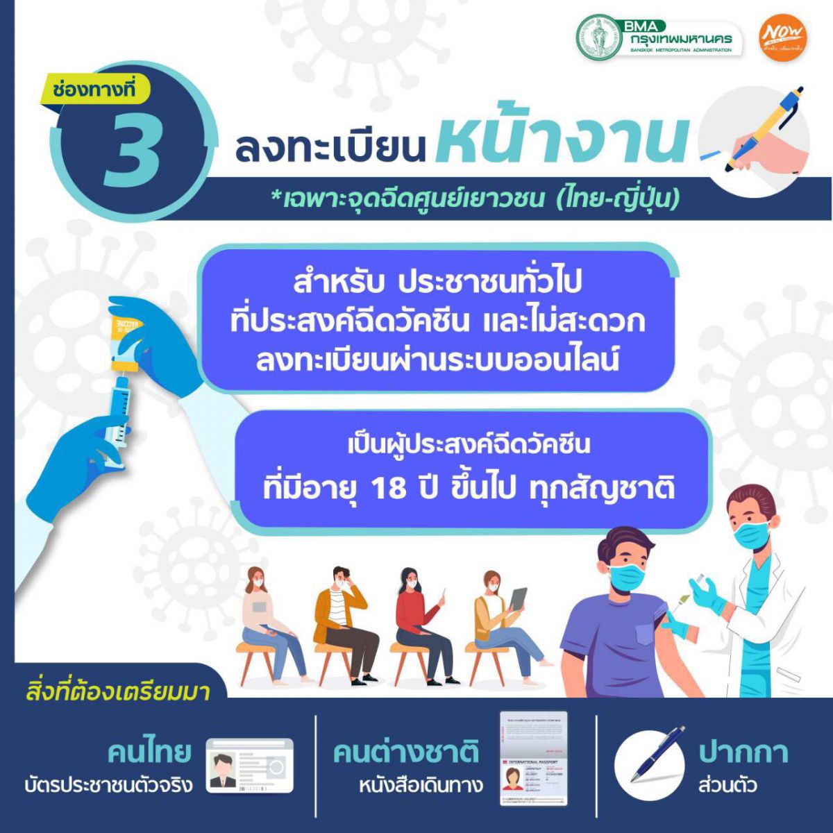 สำหรับประชาชนทั่วไปทุกสัญชาติ อายุ 18 ปีขึ้นไป ที่ประสงค์ฉีดวัคซีนแต่ไม่สะดวกลงทะเบียนออนไลน์ สามารถเดินทางมาลงทะเบียนขอรับวัคซีน ณ จุดบริการวัคซีน โดยในวันรับวัคซีนให้นำเอกสารมาแสดงตน ดังนี้ 1. บัตรประจำตัวประชาชนหรือบัตรอื่นที่ใช้ยืนยันตัวตน เช่น หนังสือเดินทาง (PASSPORT) 2. หลักฐานการจองคิวผ่านแอปพลิเคชัน “QueQ” บนมือถือ 3. หลักฐานรับรองการได้รับวัคซีนป้องกันโควิด-19 หรือใบรับรองแพทย์ว่าเคยติดเชื้อโควิด-19 กรณีลงทะเบียนฉีดวัคซีนเข็มที่ 2 เข็มที่ 3 หรือ เข็มกระตุ้นหลังติดเชื้อ
