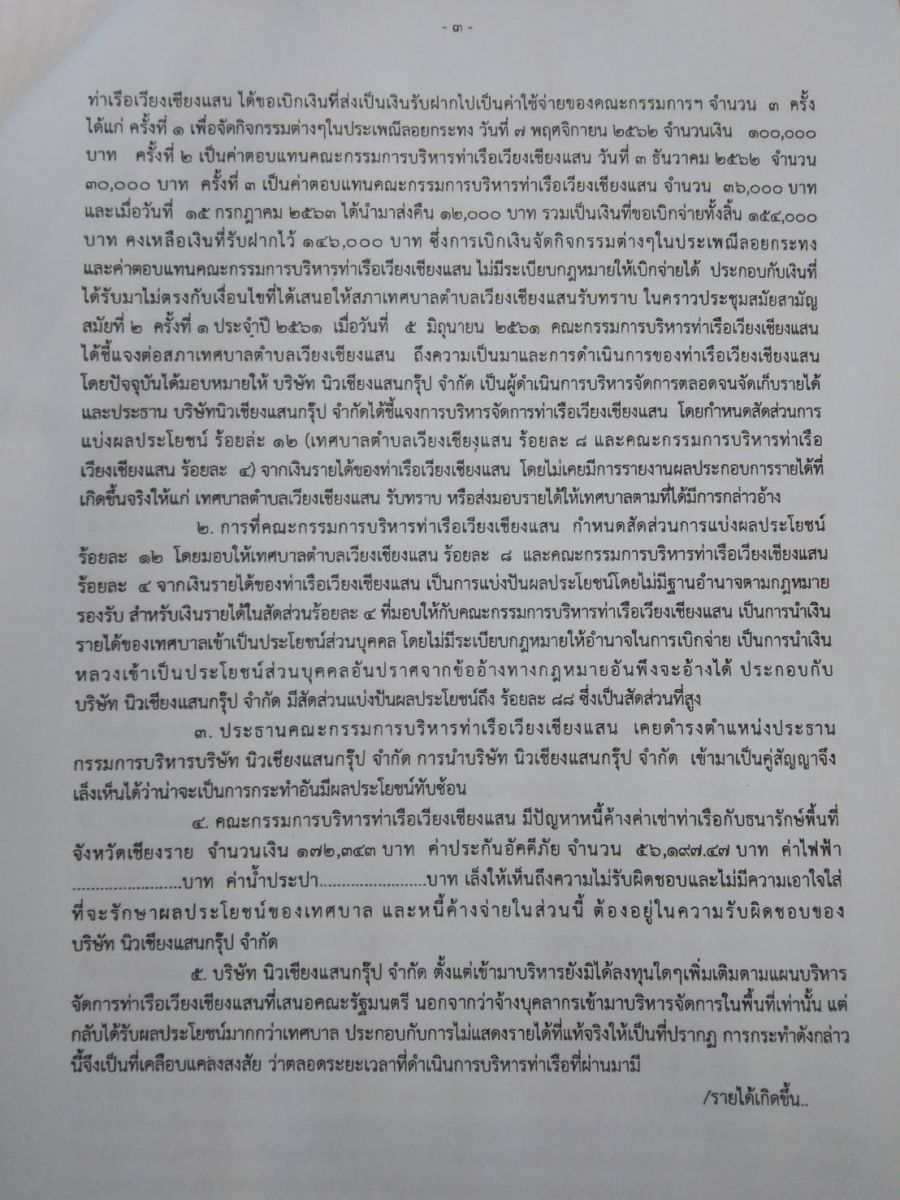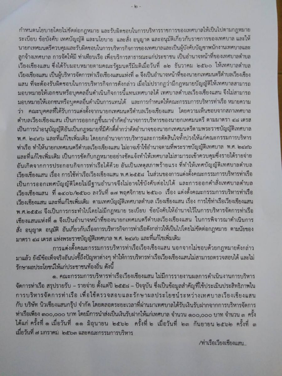 ดังนี้ เมื่อการจัดให้มีท่าเทียบเรือเพื่อบริการสาธารณะแก่ประชาชน เป็นอำนาจหน้าที่ของเทศบาลตำบล เวียงเชียงแสน ซึ่งได้รับบอบหมายตามมติคณะรัฐมนตรีเมื่อวันที่ 12 ธันวาคม 2560 ให้เทศบาลตำบล เวียงเชียงแสน เป็นผู้บริหารจัดการท่าเรือเชียงแสนแห่งที่ 1 จังหวัดเชียงราย จึงเป็นอำนาจหน้าที่ของ นายกเทศมนตรีตำบลเวียงเชียงแสน ที่จะต้องรับผิดชอบในการบริหารกิจการดังกล่าว