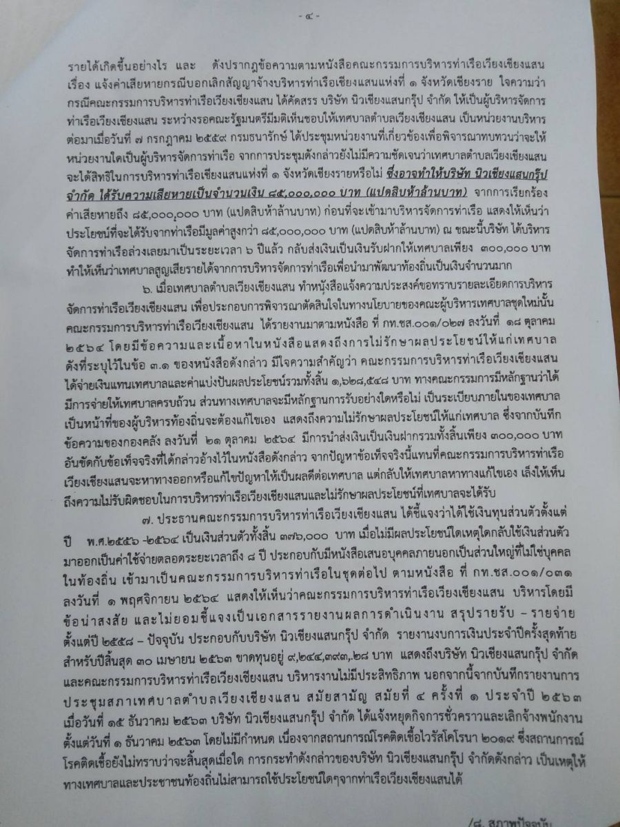 ที่ผ่านมาตั้งแต่ประมาณ ปี 2560 คณะกรรมการบริหารท่าเรือเวียงเชียงแสนได้ชี้แจงต่อสภาเทศบาลตำบลเวียงเชียงแสน สมัยที่มีผู้บริหารชุดเดิม ก่อนที่ตนจะมารับตำแหน่ง ถึงความเป็นมาและการดำเนินการของท่าเรือเวียงเชียงแสน โดยปัจจุบันได้มอบหมายให้ เอกชน รายหนึ่ง เป็นผู้ดำเนินการบริหารจัดการตลอดจนจัดเก็บรายได้ และเอกชนรายนี้ ได้ชี้แจงการบริหารจัดการท่าเรือเวียงเชียงแสน โดยกำหนดสัดส่วนการแบ่งผลประโยชน์ ร้อยล่ะ 12 (เทศบาลตำบลเวียงเชียงแสน ร้อยละ 8 และคณะกรรมการบริหารท่าเรือ เวียงเชียงแสน ร้อยละ 4) จากเงินรายได้ของท่าเรือเวียงเชียงแสน โดยไม่เคยมีการรายงานผลประกอบการรายได้ที่ เกิดขึ้นจริงให้แก่ เทศบาลตำบลเวียงเชียงแสน รับทราบ หรือส่งมอบรายได้ให้เทศบาลตามที่ได้มีการกล่าวอ้าง และทราบข่าวว่า มีการทำสัญญาเช่ากันระหว่างเอกชนและ คณะกรรมการท่าเรือเวียงเชียงแสน เป็นเวลาถึง 30 ปี ซึ่ง สำนักงานตรวจเงินแผ่นดิน หรือ สตง. และ คณะกรรมการป้องกันและปราบปรามการทุจริตแห่งชาติ หรือ ปปช.จังหวัดเชียงราย ได้เข้ามาสอบสวนเรื่องนี้อยู่ด้วย ซึ่งอนาคตเทศบาลก็มีแผนที่จะเข้าไปจัดการดำเนินงานในท่าเรือเชียงแสน เพื่อเกิดประโยชน์สูงสุดแก่ประชาชน รวมทั้งที่ดินอีก 13 ไร่ ที่อยู่ใกล้เคียงด้วย จึงเสนอต่อ ผู้ว่าราชการจังหวัดเชียงราย ขอยกเลิกคณะกรรมการบริหารท่าเรือเชียงแสน ชุดปัจจุบันนี้ แต่ก็เป็นสิทธิ์ ของคณะกรรมการบริหารท่าเรือเวียงเชียงแสน ที่จะอุทธรณ์คำสั่งนี้