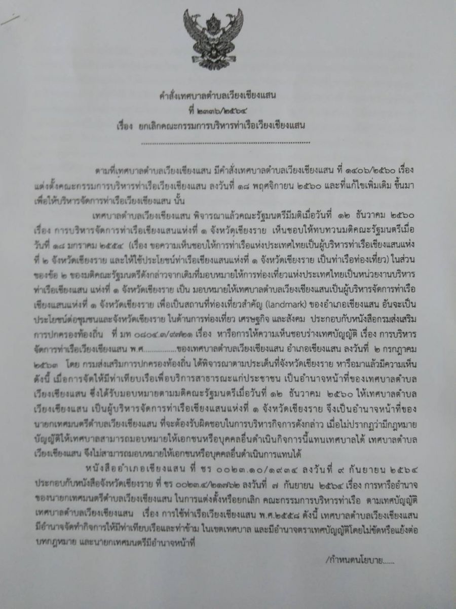 ตามที่เทศบาลตำบลเวียงเชียงแสน มีคำสั่งเทศบาลตำบลเวียงเชียงแสน ที่ 1406/2560 เรื่อง แต่งตั้งคณะกรรมการบริหารท่าเรือเวียงเชียงแสน ซึ่งตั้งอยู่ริมแม่น้ำโขง ต.เวียงเชียงแสน ลงวันที่ 18 พฤศจิกายน 2560 และที่แก้ไขเพิ่มเติม ขึ้นมา เพื่อให้บริหารจัดการท่าเรือเวียงเชียงแสน นั้น เทศบาลตำบลเวียงเชียงแสน พิจารณาแล้วคณะรัฐมนตรีมีมติเมื่อวันที่ 12 ธันวาคม 2560 เรื่อง การบริหารจัดการท่าเรือเชียงแสนแห่งที่ 1 จังหวัดเชียงราย เห็นชอบให้ทบทวนมติคณะรัฐมนตรีเมื่อ วันที่ 18 มกราคม 2554 (เรื่อง ขอความเห็นชอบให้การท่าเรือแห่งประเทศไทยเป็นผู้บริหารท่าเรือเชียงแสนแห่ง ที่ 2 จังหวัดเชียงราย และให้ใช้ประโยชน์ท่าเรือเชียงแสนแห่งที่ 1 จังหวัดเขียงราย เป็นท่าเรือท่องเที่ยว)