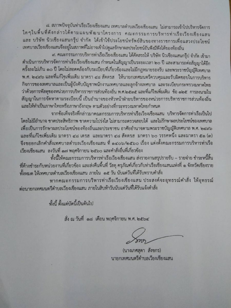 เชียงราย- นายกเทศมนตรีตำบลเวียงเชียงแสน จ.เชียงราย ลงคำสั่งในเอกสาร ประกาศ ยกเลิกคณะกรรมการบริหารท่าเรือเวียงเชียงแสน เนื่องจาก ขัดต่อกฎหมายที่จะให้เอกชนเข้ามาเช่าและบริหารท่าเรือตามคำสั่งของผู้บริหารเทศบาลชุดเดิม ถึงขั้น สตง. และ ปปช.เข้ามาตรวจสอบเรื่อง โดยเสนอต่อผู้ว่าราชการ จ.เชียงราย เพื่อพิจารณา และ เทศบาลก็มีแผนที่จะเข้าไปจัดการดำเนินงานในท่าเรือเชียงแสน เพื่อเกิดประโยชน์สูงสุดแก่ประชาชน รวมทั้งที่ดินอีก 13 ไร่ ที่อยู่ใกล้เคียง