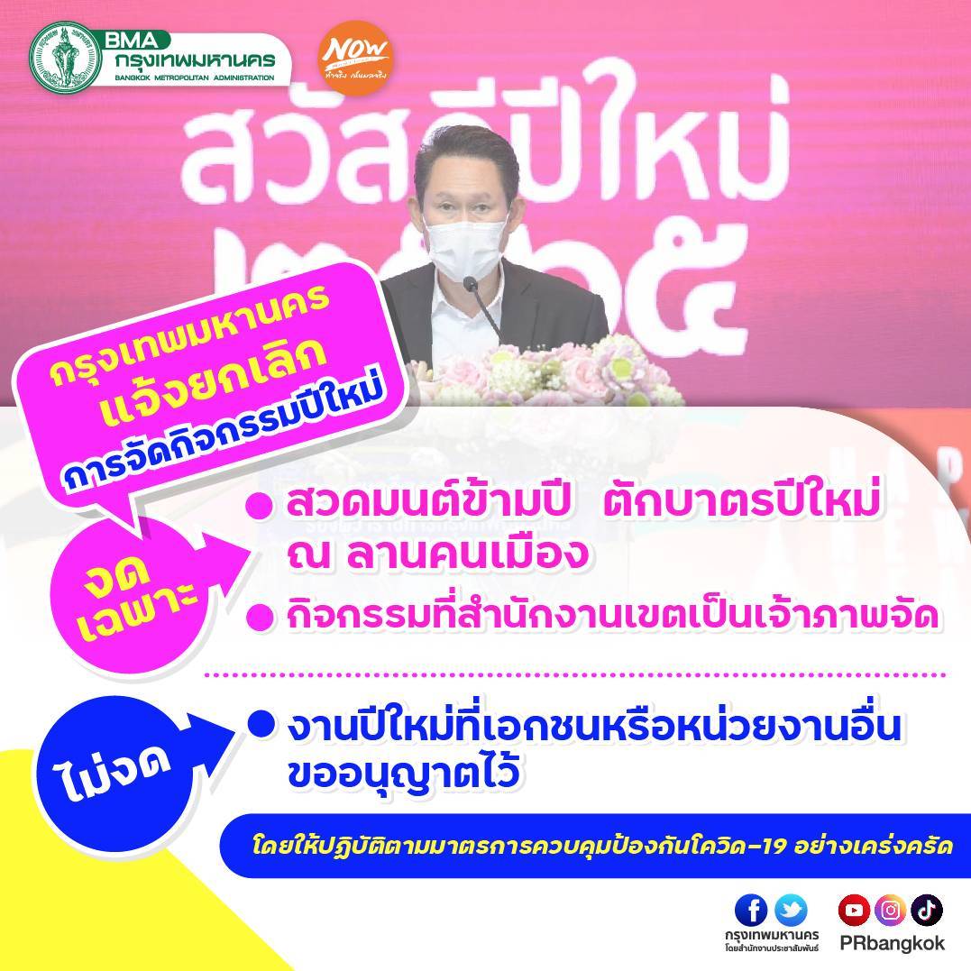 นายเกรียงยศ สุดลาภา รองผู้ว่าราชการกรุงเทพมหานคร เปิดเผยว่า ตามที่ประชุมศบค. ได้กำหนดแนวทางการจัดงานปีใหม่ระหว่างวันที่ 31 ธ.ค.64 – 1 ม.ค.65 ให้สอดคล้องกับประกาศขององค์การอนามัยโลกที่เรียกร้องให้ประเทศต่างๆ ยกเลิกแผนวันหยุดบางส่วนเพื่อปกป้องระบบสาธารณสุข เนื่องจากเชื้อไวรัสโคโรนา 2019 สายพันธุ์โอไมครอนมีการระบาดเร็วกว่าสายพันธุ์เดลต้าอย่างมีนัยยะสำคัญ ประกอบกับสถานการณ์การแพร่ระบาดของสายพันธุ์โอไมครอนในประเทศไทยพบว่ามีการระบาดอย่างรวดเร็วเช่นกัน จากข้อมูลเมื่อวันที่ 22 ธ.ค.64 มีผู้ติดเชื้อมากกว่า 100 ราย และยืนยันสายพันธุ์แล้ว 27 ราย อยู่ระหว่างการรอผล 97 ราย ดังนั้นเพื่อป้องกันการระบาดของโรคโควิด-19 สายพันธุ์โอไมครอน พล.ต.อ.อัศวิน ขวัญเมือง ผู้ว่าราชการกรุงเทพมหานคร ได้มอบหมายให้หน่วยงานในสังกัดพิจารณายกเลิกจัดงาน รวมถึงให้ยกเลิกการจัดงานปีใหม่กรุงเทพมหานครและการสวดมนต์ข้ามปี ประจำปี 2565 ณ ลานคนเมือง ศาลาว่าการกรุงเทพมหานคร รวมถึงหน่วยงานในสังกัดทั้งหมด ในส่วนของภาคเอกชนที่ประสงค์จัดงาน กรุงเทพมหานครขอความร่วมมือให้คุมเข้มมาตรการป้องกันอย่างเคร่งครัด ทั้ง Covid Free Setting การคัดกรอง การทำความสะอาดสถานที่ การเว้นระยะห่าง การจัดให้มีสถานที่กักตัวสำหรับผู้ติดเชื้อ ผู้ร่วมงานต้องมีผลการฉีดวัคซีนหรือผลตรวจ ATK ก่อนร่วมงาน 72 ชม. และลดจำนวนผู้เข้าร่วมงาน หากต้องการสอบถามข้อมูลเพิ่มเติม สามารถสอบถามได้ที่สำนักอนามัยและสำนักงานเขตพื้นที่