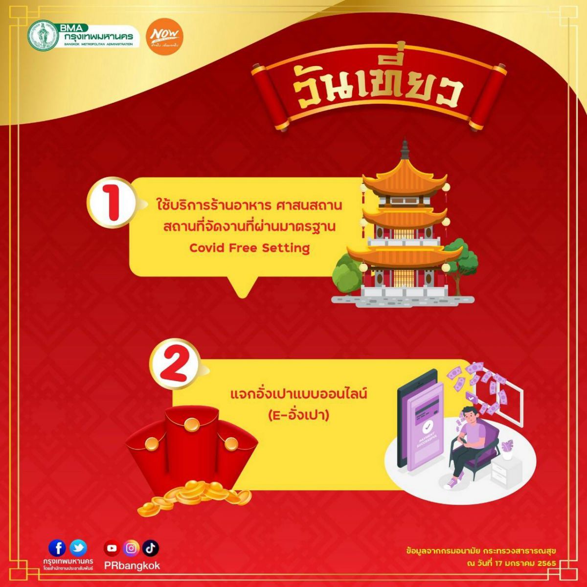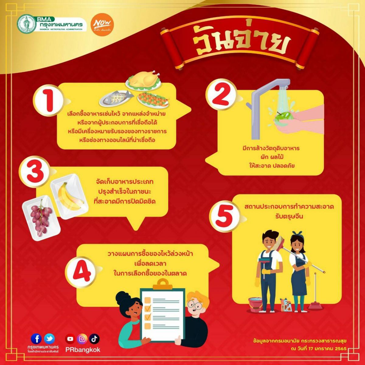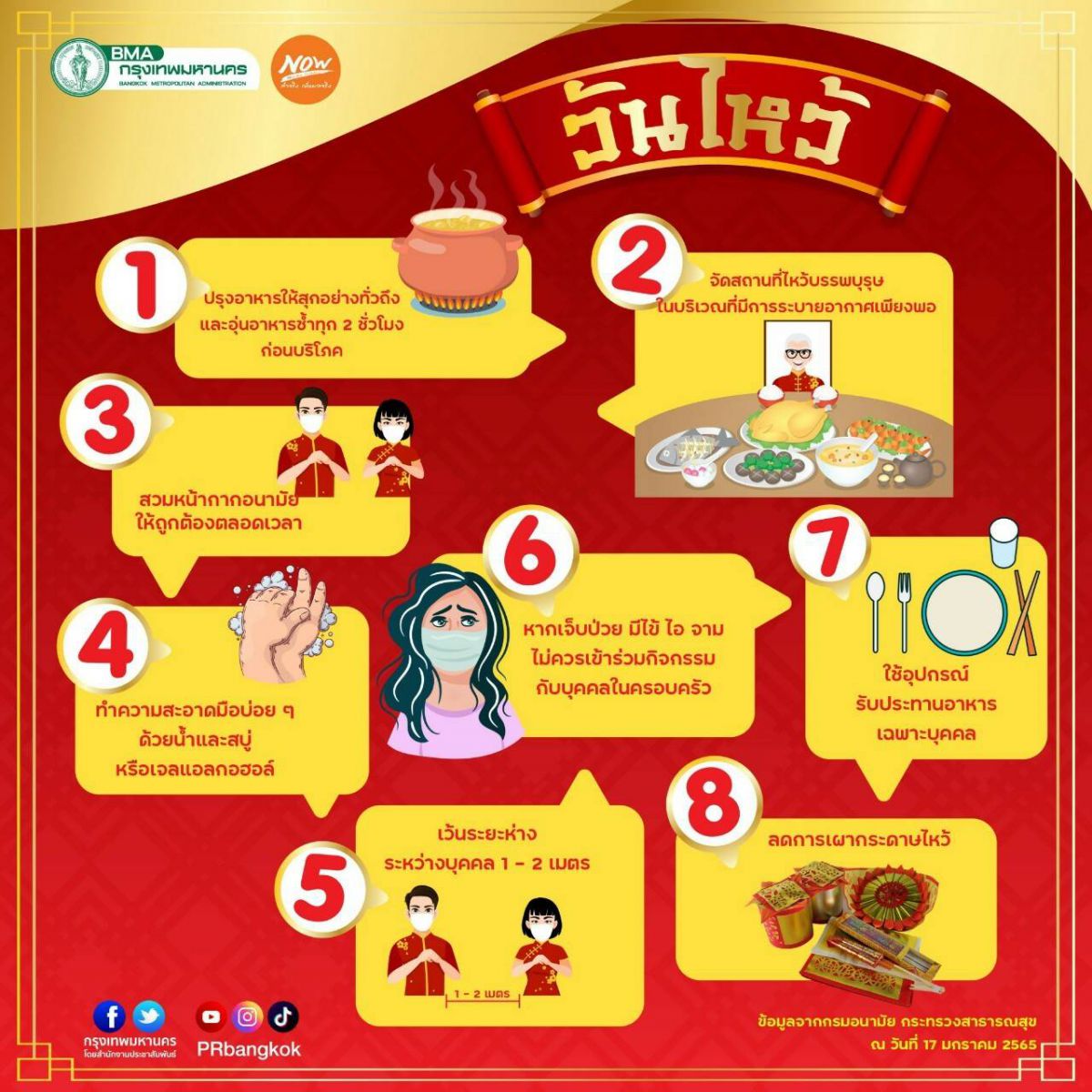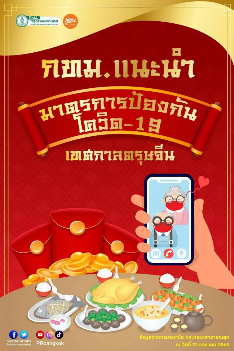 กรุงเทพมหานคร ขอความร่วมมือประชาชนปฏิบัติตามคำแนะนำตามมาตรการของกระทรวงสาธารณสุข เพื่อป้องกันการแพร่ระบาดของโรคโควิด-19 ในช่วงเทศกาลตรุษจีน ดังนี้ 1. วันจ่าย : ควรวางแผนการซื้อและใช้เวลาให้สั้นที่สุด เลือกซื้อสิ้นค้าสดใหม่ จากแหล่งจำหน่ายที่เชื่อถือได้ เช่น ตลาดที่มีการประเมิน Thai Stop COVID 2 Plus หรือจากร้านค้าที่มีระบบออนไลน์ 2. วันไหว้ : ควรล้างวัตถุดิบให้สะอาด ปรุงอาหารสุกทุกเมนู หากทิ้งอาหารไว้นานหลายชั่วโมงให้อุ่นอาหารซ้ำทุก 2 ชั่วโมง ก่อนนำมาบริโภค ลดการเผากระดาษ ใช้ธูปสั้นหรือธูปไฟฟ้า เลี่ยงการปักธูปลงในอาหารโดยตรง รวมถึงจัดสถานที่ให้มีอากาศถ่ายเทได้สะดวก และ 3. วันเที่ยว : เลี่ยงสถานที่ที่มีผู้คนแออัด หากมีการใช้จ่าย เลือกใช้ระบบออนไลน์ เลือกใช้บริการจากสถานประกอบการ แหล่งท่องเที่ยวที่มีสัญลักษณ์ Thai Stop COVID 2 Plus หรือ SHA+ และเมื่อกลับถึงบ้านให้อาบน้ำเปลี่ยนเสื้อผ้าทันที โดยทั้งสามวันนี้ สมาชิกทุกคนในครอบครัวต้องรักษามาตรการส่วนบุคคลอย่างเคร่งครัด ดังนี้ D : Social Distancing เว้นระยะห่าง 1-2 เมตร เลี่ยงการอยู่ในที่แออัด เมื่อไปเยี่ยมญาติ ควรรีบกลับ ไม่ใช้เวลาอยู่ร่วมกันนานเกินไป M : Mask Wearing สวมหน้ากากผ้าหรือหน้ากากอนามัยตลอดเวลา H : Hand Washing ล้างมือบ่อยๆ ด้วยน้ำและสบู่ หรือเจลแอลกอฮอล์ T : Testing การตรวจวัดอุณหภูมิและตรวจหาเชื้อโควิด-19 ในกรณีที่มีอาการเข้าข่าย T : Thai Cha Na สแกนไทยชนะก่อนเข้า-ออกสถานที่สาธารณะทุกครั้ง เพื่อให้มีข้อมูลในการประสานงานได้ง่ายขึ้น หากมีอาการป่วยด้วยอาการทางเดินหายใจ ควรอยู่บ้าน ไม่ควรไปออกไปพบปะคนอื่น