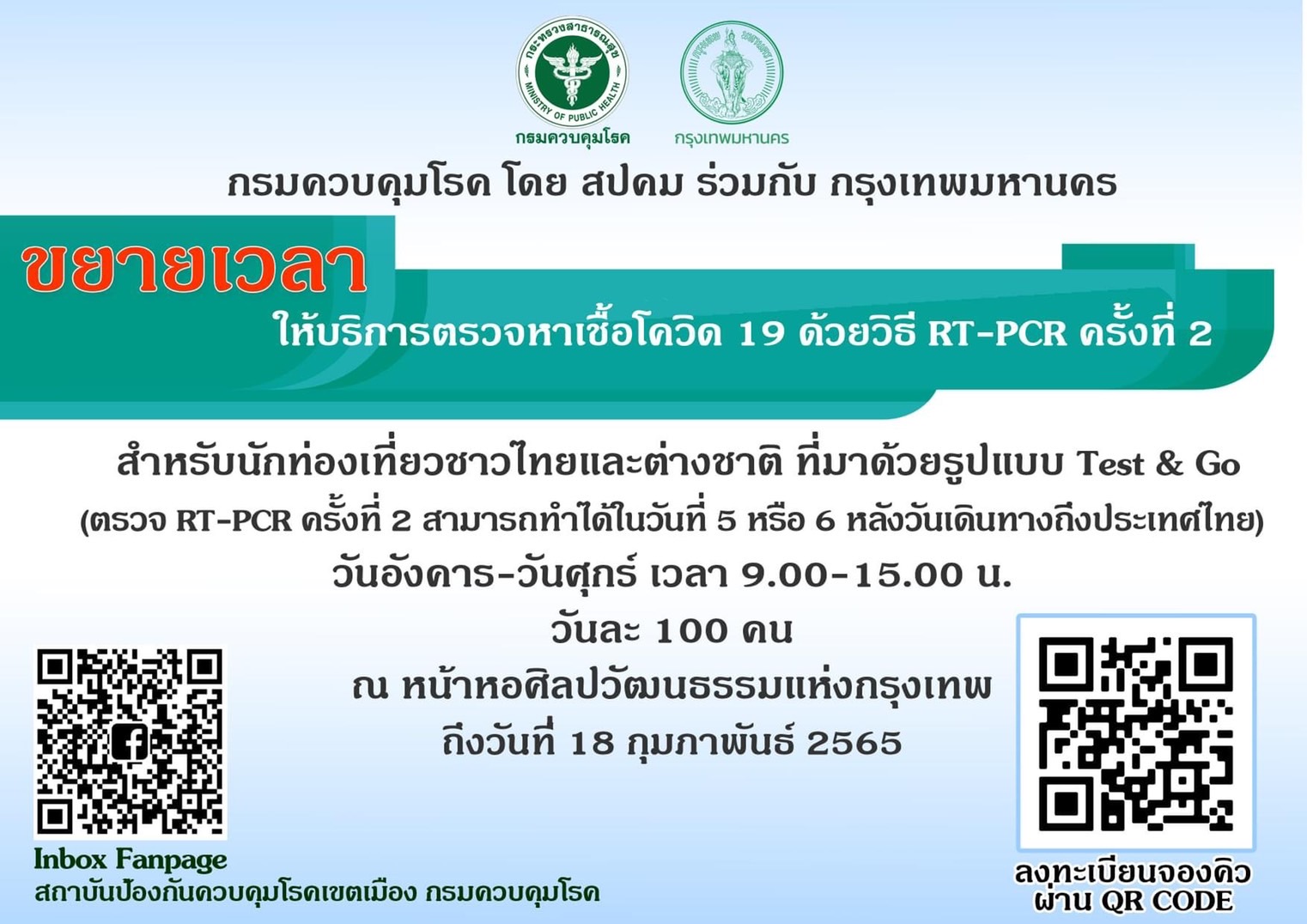 กรุงเทพมหานคร ร่วมกับ กรมควบคุมโรค โดยสถาบันป้องกันควบคุมโรคเขตเมือง ให้บริการตรวจ RT PCR ครั้งที่ 2 สำหรับชาวไทยและนักท่องเที่ยวที่เดินทางเข้ามาในระบบ Test & Go ในวันที่ 5 หรือ 6 หลังเดินทางถึงประเทศไทย ณ จุดตรวจบริเวณหน้าหอศิลปวัฒนธรรมแห่งกรุงเทพ โดยสามารถจองคิวเพื่อรับบริการล่วงหน้า (จำกัดวันละ 100 คน) ได้ตั้งแต่บัดนี้ถึง 18 ก.พ. 65 ในวันอังคาร-วันศุกร์ ตั้งแต่เวลา 09.00-15.00 น. เพื่อตรวจหาเชื้อโควิด 19 ด้วยวิธี RT-PCR สำหรับนักท่องเที่ยวชาวไทยและต่างชาติ ที่มาด้วยรูปแบบ Test and Go