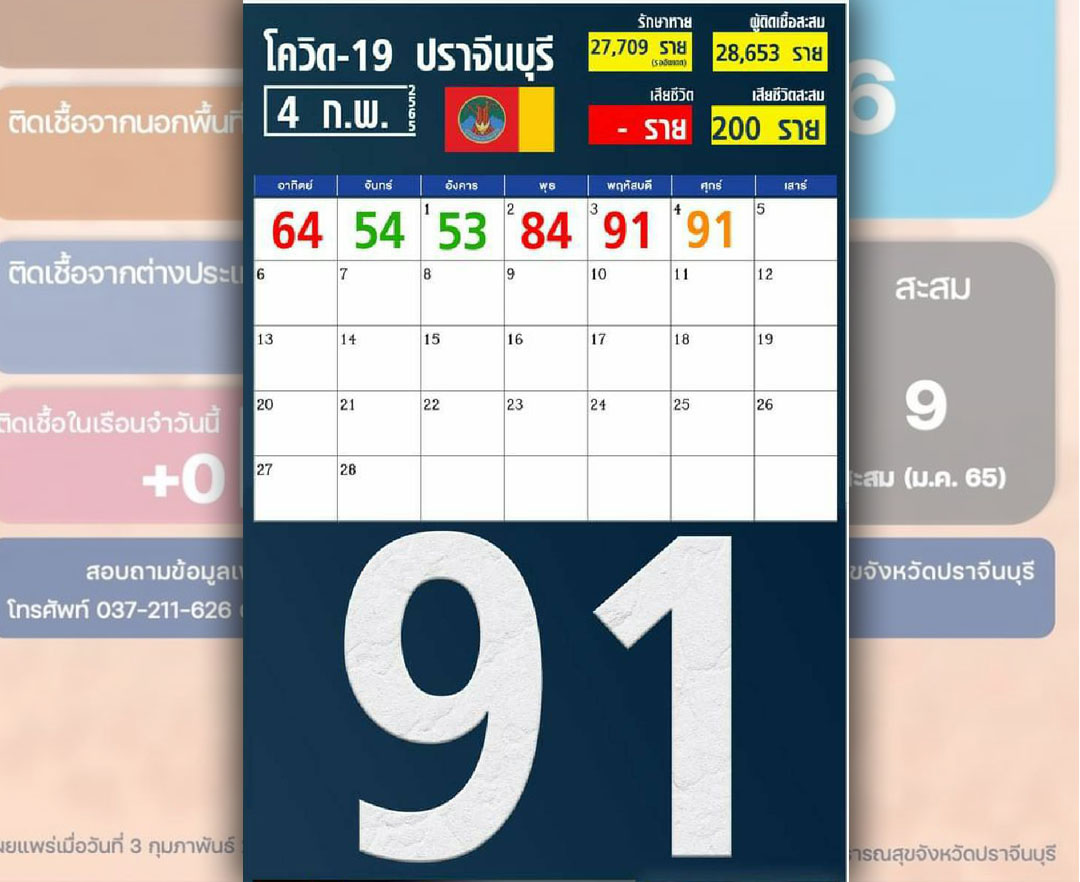 พบผู้ติดเชื้อ ระลอกมกราคม 2565 เพิ่ม 91 ราย สะสมรวม 1,681 ราย จำแนกตาม Cluster (ผู้ป่วยยืนยัน รายที่ 1,591-1,681) เป็นกลุ่มคลัสเตอร์งานอุปสมบทวัดศรีวนาลัย (วัดโคกสั้น) อ.กบินทร์บุรี จำนวน 7 ราย เชื่อมโยงคลัสเตอร์เทศบาลตำบลโคกปีบ อ.ศรีมโหสถ จำนวน 7 ราย เชื่อมโยงคลัสเตอร์โรงเรียนหทัยชาติ จำนวน 2 ราย ผู้ที่มีประวัติสัมผัสใกล้ชิดผู้ป่วยยืนยัน จำนวน 59 ราย ,ผู้ที่มีประวัติเดินทางไป-กลับมาจากพื้นที่เสี่ยง จำนวน 2 ราย , ผู้ป่วยนอกเขตเข้ามารับการตรวจและรักษา จำนวน 2 ราย , ผู้ป่วยมีอาการและอยู่ระหว่างการสอบสวนโรค จำนวน 12 ราย