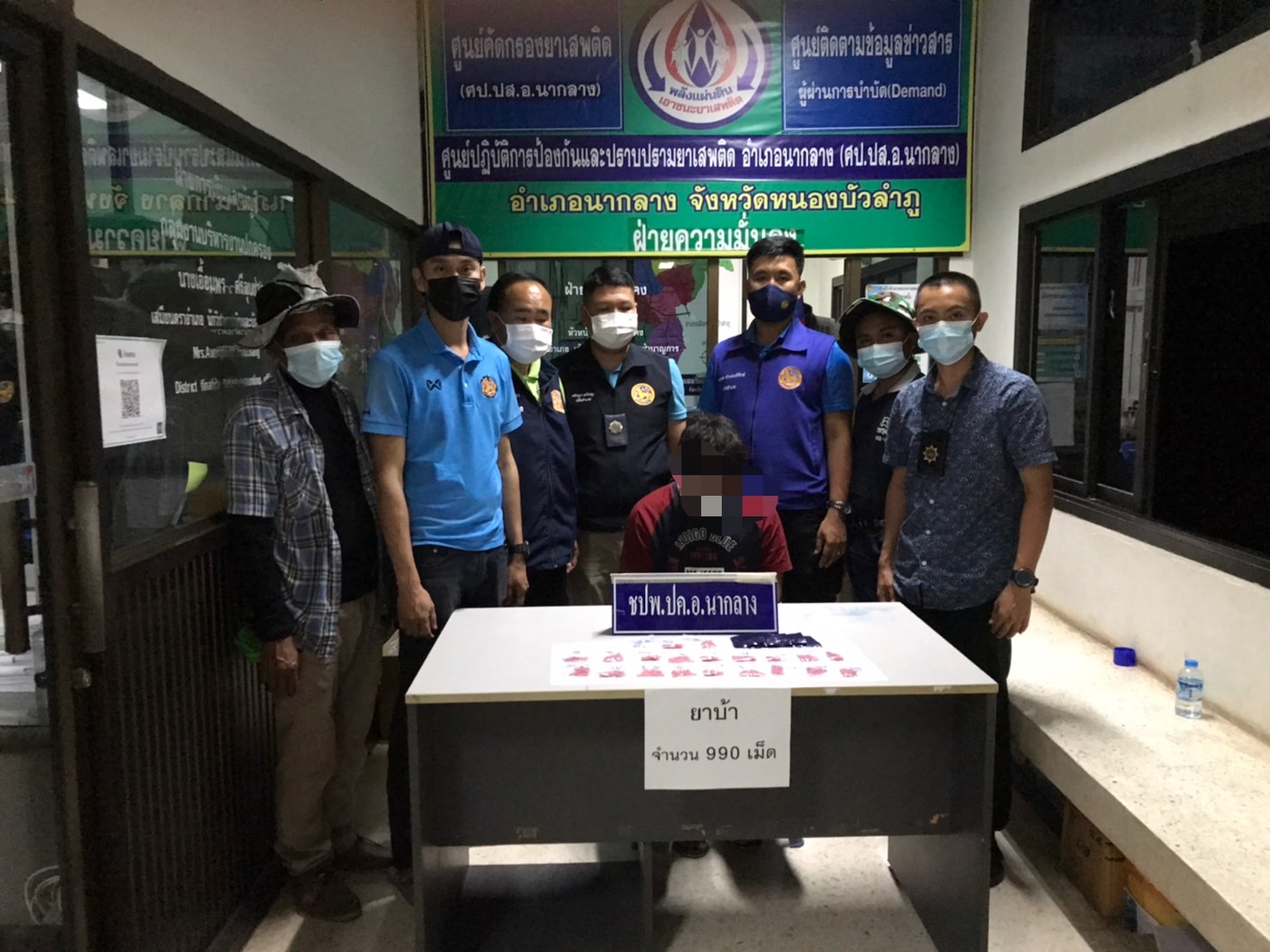 เมื่อวันที่ 11 ก.พ.2565 ผู้สื่อข่าวรายงานว่า นางศิวพร ฉั่วสวัสดิ์ ผู้ว่าราชการจังหวัดหนองบัวลำภู ได้สั่งการให้ทุกพื้นที่ในเขต จ.หนองบัวลำภู ให้ออกหาข่าวและจับกุมผู้ที่ยุ่งเกี่ยวกับยาเสพติด ต่อมานายชยังกูร เสริมสุข ปลัดอำเภอนากลาง ,นายคุรุวิทย์ สุดชา ปลัดอำเภอนากลาง ,นายปราบ โพธิ์ศรีงาม เจ้าหน้าที่ปกครองชำนาญงาน, มญ.เสถียร วงษ์โท, มญ.ถนอม สุพรรณภูวงศ์ , มท.นพดล บุรุษภักดี, มต.ธีระยุทธ ลาลู่,อส.อ.รวิพล สินทรโก, อส.ท.ศุภชัย ศรีหาบุตร, อส.ต.วีรยุทธ พิลึกนา และชุดปฏิบัติการพิเศษฝ่ายปกครองนากลาง จับกุมนายศิริพงษ์ หรือ เจมส์บอล อายุ 21 ปี บ้านนันทจันทร์ ตำบลนากลาง อำเภอนากลาง จังหวัดหนองบัวลำภู พร้อมยาบ้า 990 เม็ด ,ผลตรวจปัสสาวะเป็นสีม่วง สามารถจับกุมได้ที่บ้านนันทจันทร์ ตำบลนากลาง อำเภอนากลาง จังหวัดหนองบัวลำภู