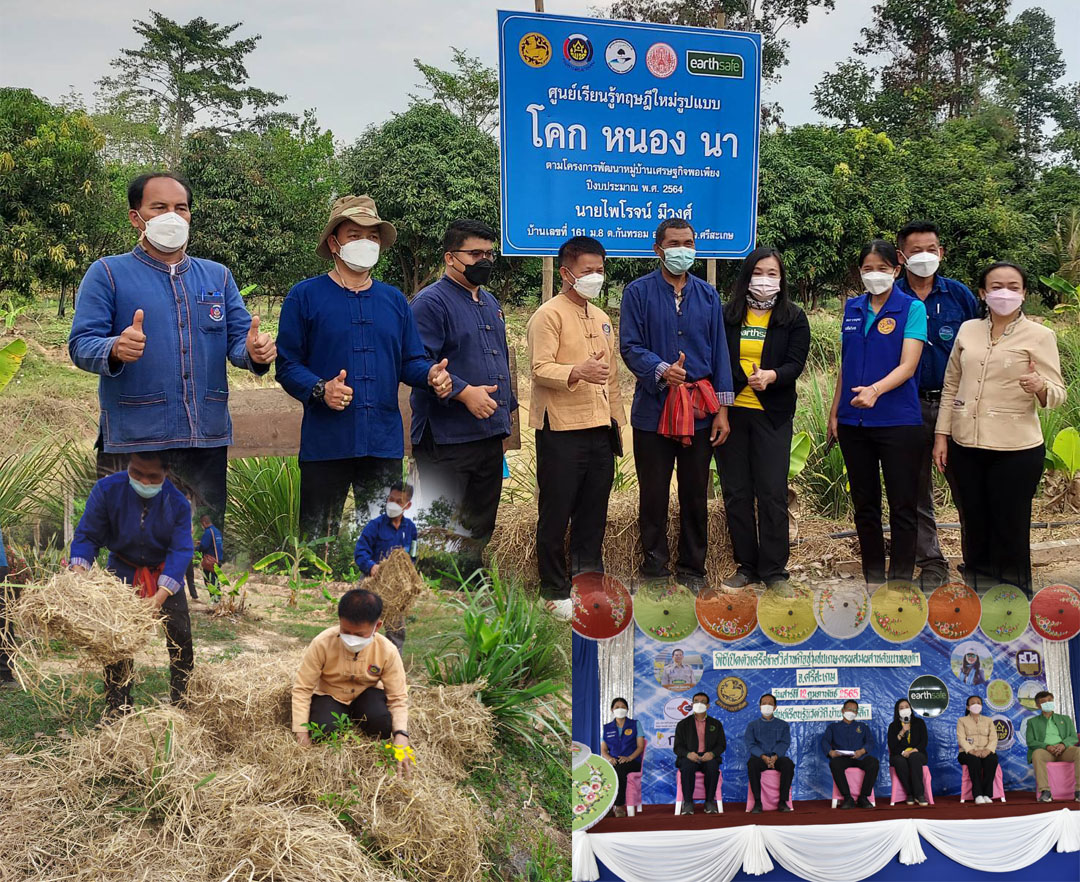 เมื่อวันที่ 12 กุมภาพันธ์ 2565 เวลา 13.30 น. ที่บ้านตาเอกใหม่ ตำบลกันทรอม อ.ขุนหาญ จ.ศรีสะเกษ นายนิวัติ น้อยผาง รองอธิบดีกรมการพัฒนาชมชุม นางสัณหจุฑา จิราธิวัฒน์ ประธานมูลนิธิรักษ์ดินรักษ์น้ำ หรือ Earth Safe Foundation และผู้ช่วยศาสตราจารย์ ดร.ฐิตารีย์ ไตรสรณปัญญา (ดร.จุ๋ม) คณะที่ปรึกษารัฐมนตรีว่าการกระทรวงเกษตรและสหกรณ์ ได้เดินทางไปตรวจเยี่ยมโครงการพัฒนาหมู่บ้านเศรษฐกิจพอเพียง ปี 2564 กิจกรรมพัฒนาศูนย์เรียนรู้ทฤษฎีใหม่รูปแบบโคกหนองนา ของนายไพโรจน์ มีวงศ์ เกษตรกรบ้านตาเอกใหม่ หมู่ 8 ตำบลกันทรอม อำเภอขุนหาญ โดยมีนางสาวอมร นามบุตร ปลัดอาวุโสอำเภอขุนหาญ รักษาราชการนายอำเภอขุนหาญ นายชัยยงค์ ผ่องใส หน.กลุ่มงานยุทธศาสตร์การพัฒนาชุมชน และนายอมร ธุษาวัน พัฒนาการอำเภอขุนหาญ นำเกษตรกรอำเภอขุนหาญ ให้การต้อนรับและนำตรวจเยี่ยมโครงการพัฒนาหมู่บ้านเศรษฐกิจพอเพียง ปี2564 กิจกรรมพัฒนาศูนย์เรียนรู้ทฤษฎีใหม่รูปแบบโคกหนองนา งบยุทธศาสตร์กรมการพัฒนาชุมชน ขนาด 1 ไร่ งบประมาณได้รับจัดสรรค่าดปรับแปลง จำนวน 45,200 บาท โดยเบิกจ่าย จำนวน 17,429 บาท และได้รับงบประมาณจัดซื้อพันธุ์พืชพันธุ์สัตว์ จำนวน 2,360 บาท มีพื้นที่ทำการทั้งหมด 12 ไร่ทำเป็น "วนเกษตร" จัดสรรพื้นที่ตามหลักทฤษฎีใหม่ปลูกพืชผสมผสานและไม้ป่ายืนต้น ปลูกป่า 5 ระดับ ปลูกพืชสมุนไพร ขุดหนองน้ำเพื่อเก็บน้ำไว้ใช้หน้าแล้ง จัดสรรพื้นที่ทำนา ทำคันนาทองคำมีการบริหารจัดการน้ำ ภายในแปลโดยด้านหลังแปลงมีลำห้วยจันทร์ ด้านหน้าแปลงมีคลองชลประทานจากอ่างเก็บน้ำห้วยตาจู ขุดคลองไส้ไก่ส่งน้ำหล่อเลี้ยงพืชในแปลงของนายไพโรนจน์ ซึ่งอาชีพที่ยั่งยืนคือ อาชีพเกเษตรกรและอาชีพที่มั่นคงคือ เกษตรแบบอินทรีย์เศรษฐกิจพอเพียงคือทางรอดของสังคมไทย โดยเฉพาะในยามวิกฤต covid-19 ปัจจุบันนี้