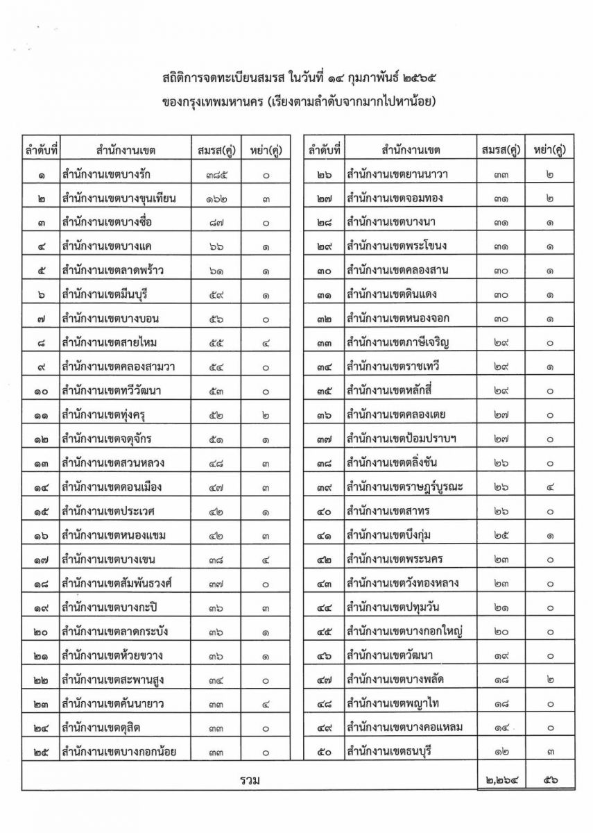 นายขจิต ชัชวานิชย์ ปลัดกรุงเทพมหานคร เปิดเผยถึงการจดทะเบียนสมรส ในวันที่ 14 กุมภาพันธ์ 2565 ของกรุงเทพมหานคร ทั้ง 50 สำนักงานเขต มีคู่สมรสเข้ามาจดทะเบียนสมรส รวมจำนวน 2,264 คู่ โดยสำนักงานเขตที่มีการจดทะเบียนฯ มากที่สุดยังคงเป็นสำนักงานเขตบางรัก 385 คู่ รองลงมาอีก 9 เขต ได้แก่ สำนักงานเขตบางขุนเทียน 162 คู่ เขตบางซื่อ 87 คู่ เขตบางแค 66 คู่ เขตลาดพร้าว 61 คู่ เขตมีนบุรี 59 คู่ เขตบางบอน 56 คู่ เขตสายไหม 55 คู่ เขตคลองสามวา 54 คู่ เขตทวีวัฒนา 53 คู่ โดยสำนักงานเขตธนบุรีมีการจดทะเบียนสมรสน้อยที่สุด 12 คู่ และในวันนี้ได้ให้บริการจดทะเบียนหย่ารวมจำนวน 56 คู่