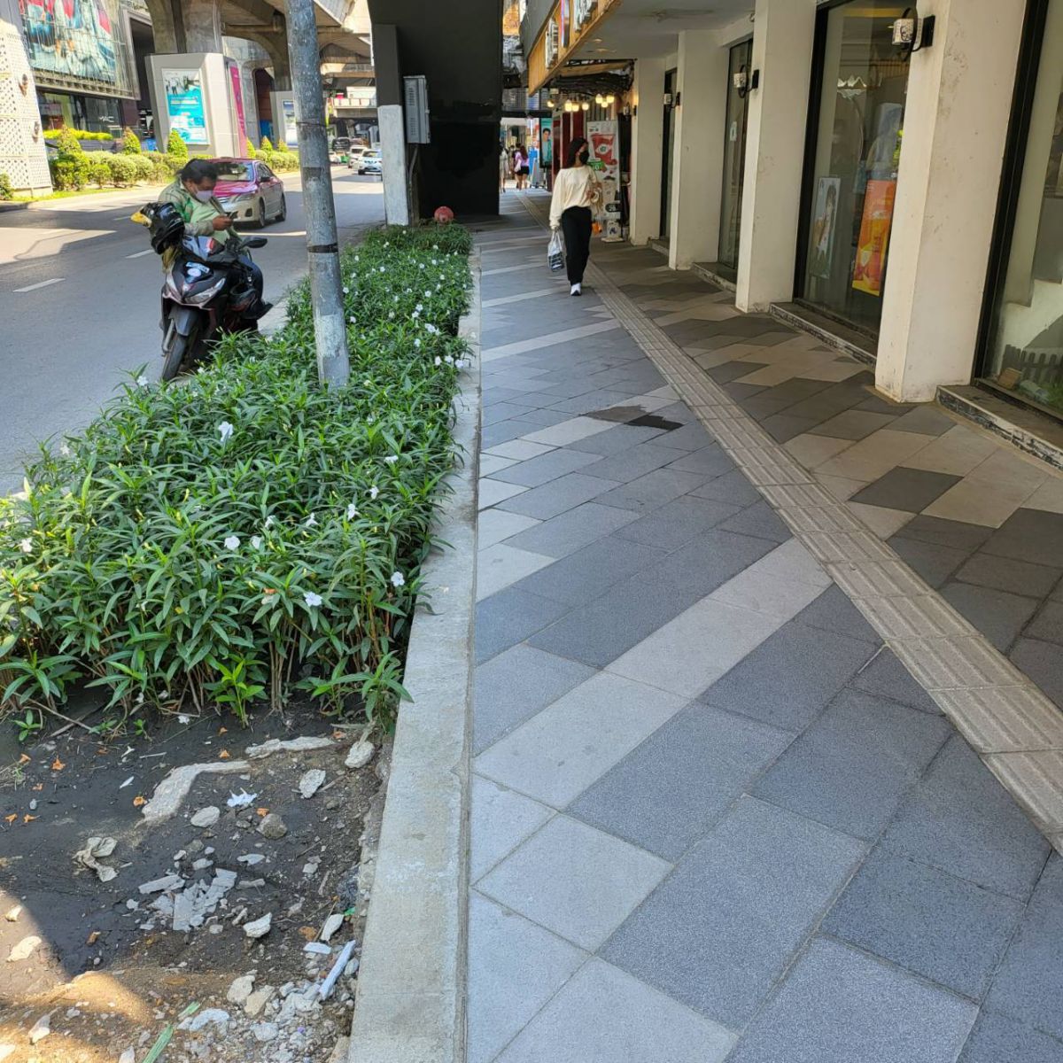 นอกจากนี้จะขยายทางเท้าให้มีความกว้างอย่างน้อย 2.4 เมตร ตามมาตรฐานสากล โดยจัดระเบียบป้าย เสาไฟ พื้นที่สีเขียว ให้อยู่ในแนวเดียวกัน ทำฐานป้ายทุกป้าย ฐานเสาทุกอุปกรณ์บนถนนให้เรียบเสมอทางเท้า และปรับขนาดป้อมตำรวจให้มีขนาดเล็กลง รวมทั้งปรับระดับทางเท้าให้สูงจากพื้นถนนไม่เกิน 10 เซนติเมตร เพื่อไม่ให้ชันเกินไป ที่สำคัญคือการทำทางเท้าสำหรับคนพิการและผู้สูงอายุ ที่มีแผ่นทางเท้าคนพิการ (Braille Block) และทางลาดเชื่อมต่อทางเดินอย่างปลอดภัย ตลอดจนกำหนดแนวปลูกต้นไม้ให้ชัดเจนเป็นแนวเดียวกับการติดตั้งสาธารณูปโภค เสาไฟ และป้าย นอกจากเพื่อความร่มรื่นแล้ว ยังให้เป็นพื้นที่รับน้ำ (Rain Garden) โดยปรับองศาทางเท้า เพื่อให้น้ำไหลลงพื้นที่ Rain Garden ไม่ท่วมขังบนทางเท้าเมื่อฝนตก