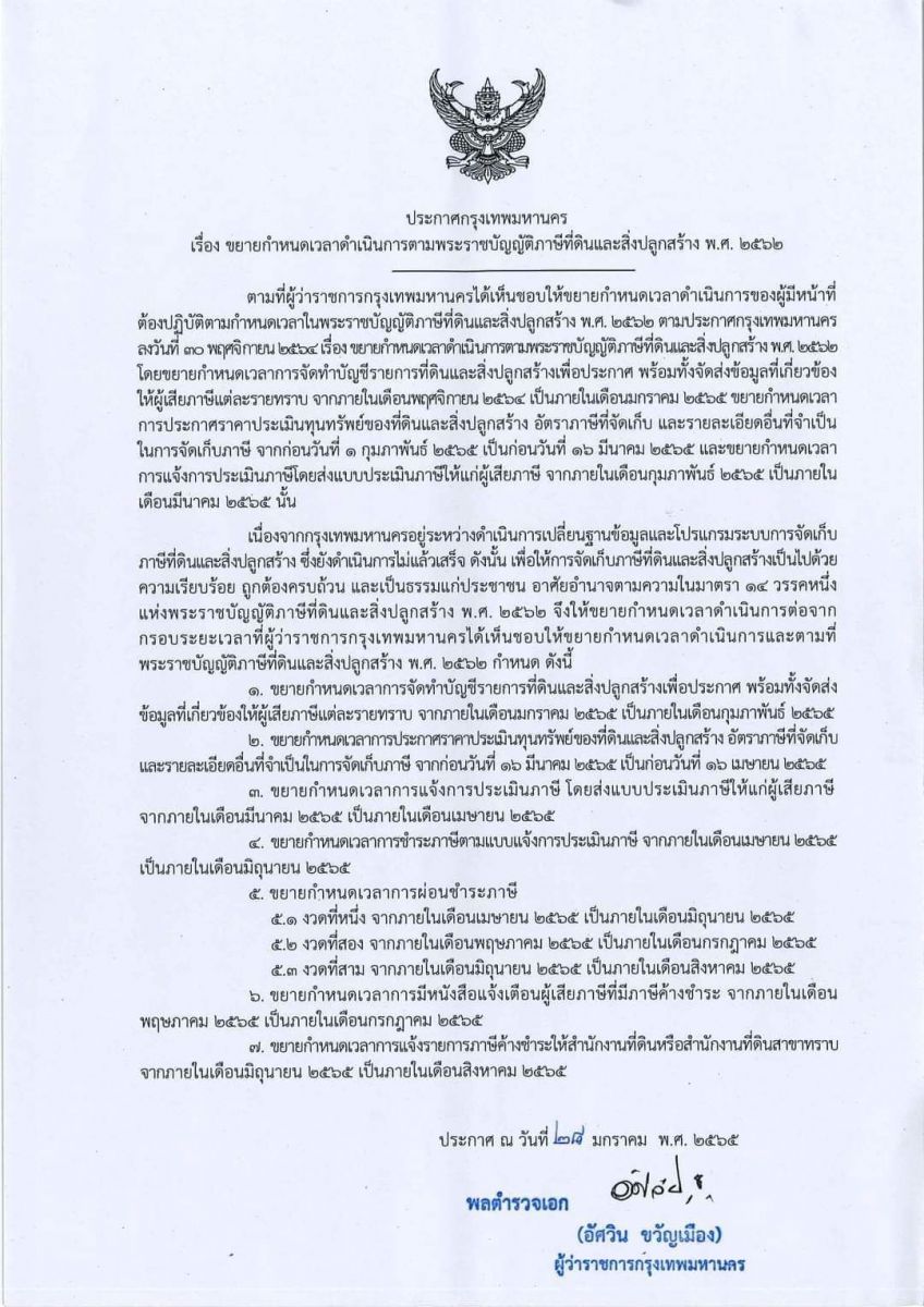 (22 ก.พ. 65) นางสุธาทิพย์ สนเอี่ยม รองปลัดกรุงเทพมหานคร แจ้งว่า กรุงเทพมหานครได้ขยายกำหนดเวลาดำเนินการตามพระราชบัญญัติภาษีที่ดินและสิ่งปลูกสร้าง พ.ศ. 2562 ดังนี้