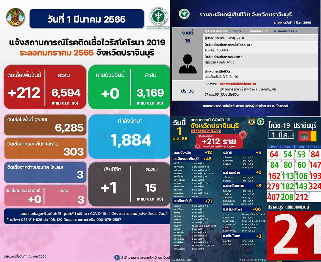 เมื่อเวลา 20.20 น.วันนี้ 1 มี.ค.65 ผู้สื่อข่าว จ.ปราจีนบุรีรายงานว่า สำนักงานสาธารณสุข จ.ปราจีนบุรี แจ้งสถานการณ์โรคติดเชื้อไวรัสโคโรนา 2019 ระลอกมกราคม 2565 จังหวัดปราจีนบุรี ณ วันที่ 28 กุมภาพันธ์ 2565พบผู้ติดเชื้อ ระลอกมกราคม 2565 เพิ่ม 208 ราย สะสมรวม 6,382 ราย ผู้เสียชีวิต จำนวน 1 ราย รายที่ 15 ระลอกมกราคม 2565 ของจังหวัดปราจีนบุรี