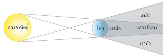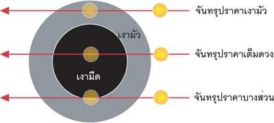 - จันทรุปราคาเงามัว (Penumbra Eclipse) เกิดขึ้นเมื่อดวงจันทร์โคจรผ่านเข้าไปในเงามัวเพียงอย่างเดียว เราจึงมองเห็นดวงจันทร์เต็มดวงมีสีคล้ำเนื่องจากความสว่างลดน้อยลง จันทรุปราคาเงามัวหาดูได้ยาก เพราะโดยทั่วไปดวงจันทร์มักจะผ่านเข้าไปในเงามืดด้วย