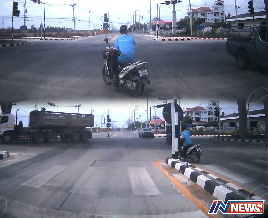 ฉะเชิงเทรา-ขับมักง่าย ใจต้องพร้อมที่จะเสี่ยงกับความตายกลายเป็นผีนอนเฝ้าท้องถนน หลัง จจย. ขับย้อนทางแยกพุ่งออกมาโดยที่ไม่มองรถในเส้นทางให้ดีเสียก่อนจนเกือบถูกรถบรรทุกพุ่งชนอย่างจังเต็มกระจังหน้า แต่โชคดีที่คนขับได้เห็นท่าทีของคนขับรถ จยย. เสียก่อน จึงยังช่วยเบรกจนล้อลากเพื่อหยุดตัวรถเอาไว้ได้ทัน ในระยะกระชั้นชิดเพียงไม่ถึง 1 เมตร