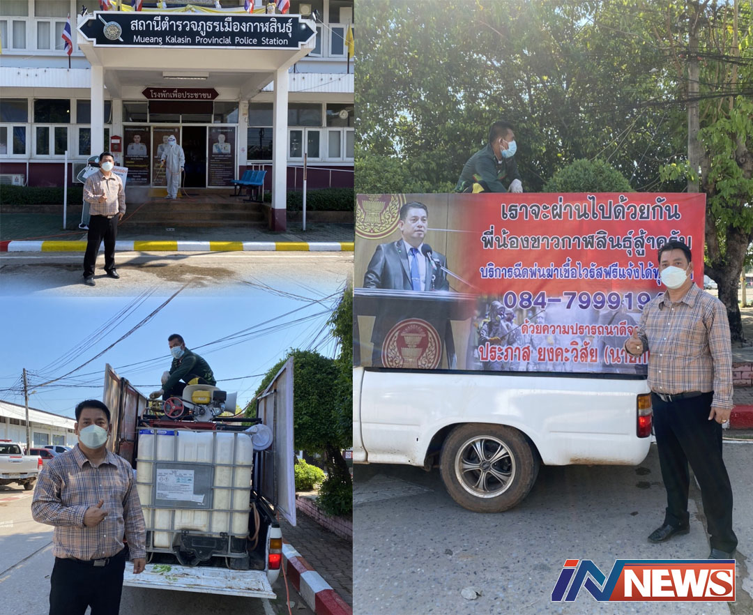 กาฬสินธุ์-ประชาชนจิตอาสา จัดทีมให้บริการฉีดพ่นยาป้องกันโควิด-19 ที่โรงพักเมืองกาฬสินธุ์ ฟรี พร้อมประชาสัมพันธ์เชิญชวนส่วนราชการ หน่ายงาน ประชาชนทั่วไป ในพื้นที่จังหวัดกาฬสินธุ์ ที่ต้องการใช้บริการ ยินดีให้บริการฟรีโดยเสียค่าใช้จ่ายแต่อย่างใด