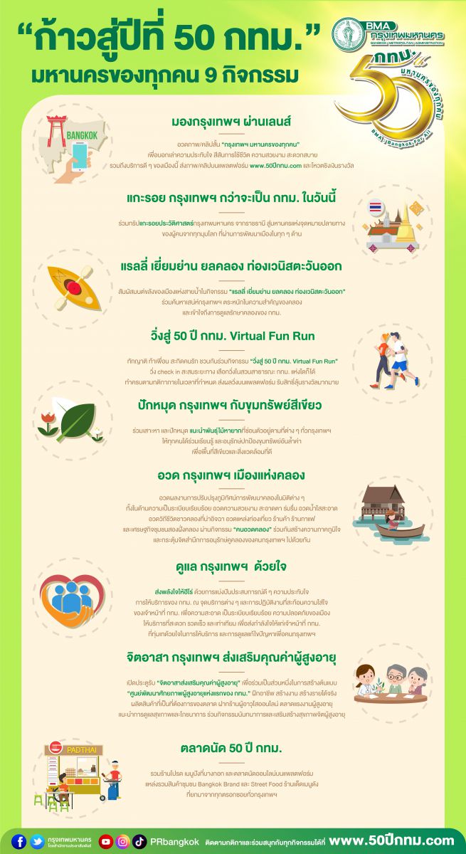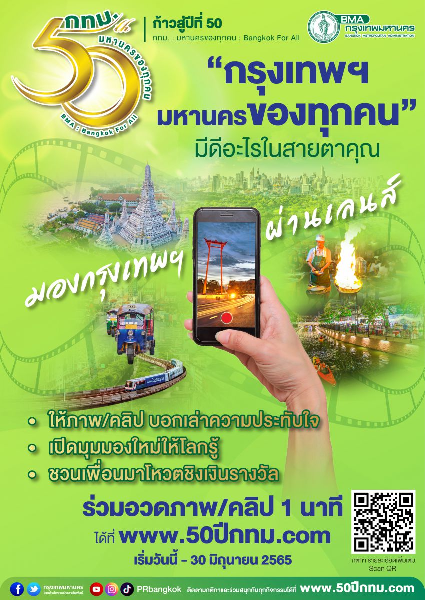 กรุงเทพมหานครจึงขอเชิญชวนผู้สนใจติดตามรายละเอียดกิจกรรม “ก้าวสู่ปีที่ 50 กทม.” และร่วมสนุกกับทั้ง 9 กิจกรรมอย่างต่อเนื่อง พร้อมขอเชิญชวนร่วมกิจกรรมแรก “มองกรุงเทพฯ ผ่านเลนส์” โดยอวดภาพพร้อมคำบรรยายสั้น ๆ ไม่เกิน 5 ภาพต่อคน หรือคลิปสั้น ความยาวไม่เกิน 1 นาที ภายใต้หัวข้อ “กรุงเทพฯ มหานครของทุกคน” เพื่อบอกเล่าความประทับใจ สีสันการใช้ชีวิต ความสวยงาม สะดวกสบาย รวมถึงบริการดี ๆ ของเมืองนี้ และชวนเพื่อนมาร่วมโหวต ชิงเงินรางวัลมูลค่ารวมกว่า 1 แสนบาท โดยส่งผลงานทางแพลตฟอร์มเว็บไซต์ www.50ปีกทม.com ตั้งแต่บัดนี้ถึงวันที่ 30 มิ.ย. 65 สามารถอ่านกติกาเพิ่มเติมได้ที่ https://me-qr.com/r6OLN