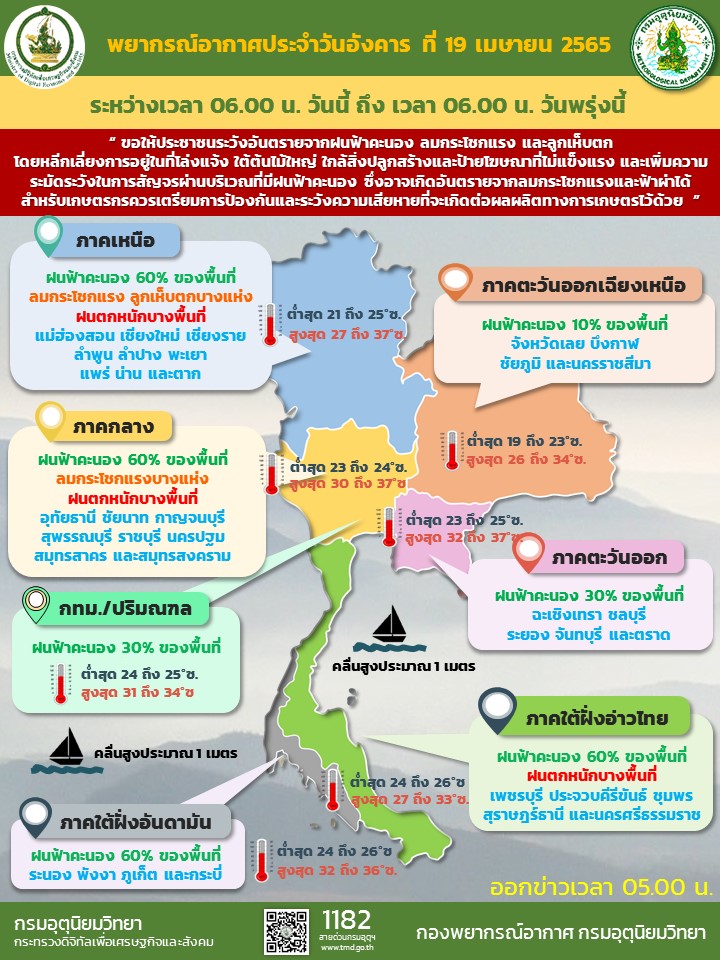 ประจำวันอังคารที่ 19 เมษายน พ.ศ. 2565 เวลา 07.00 น. ค่าเฉลี่ย 24 ชั่วโมง ของฝุ่นละอองขนาดไม่เกิน 2.5 ไมครอน (PM2.5)ตรวจวัดได้ 14-35 ไมโครกรัม/ลูกบาศก์เมตร (มคก./ลบ.ม.) พบว่าไม่เกินมาตรฐานทุกพื้นที่ที่มีการตรวจวัด (มาตรฐานไม่เกิน 50 มคก./ลบ.ม.) ดัชนีคุณภาพอากาศของสถานีตรวจวัดของกรุงเทพมหานคร: ส่วนใหญ่อยู่ในระดับคุณภาพอากาศดีมากกรมอุตุนิยมวิทยา พยากรณ์สภาพอากาศในพื้นที่กรุงเทพมหานคร/ปริมณฑล: ฝนฟ้าคะนอง 30% ของพื้นที่