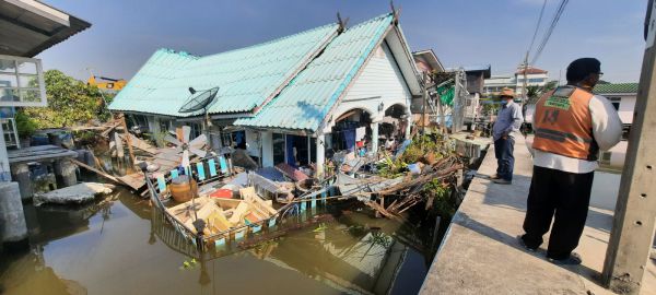สมุทรปราการ--หนุ่มช่างรับเหมาติดตั้งตู้คอนโทรลอุ้มแม่ป่วยติดเตียงวิ่งหนีตาย หลังบ้านพังถล่มลงน้ำได้รับบาดเจ็บ ที่ถนนประชาอุทิศ-คู่สร้าง หมู่ที่ 10 ต.ในคลองบางปลากด อ.พระสมุทรเจดีย์ จ.สมุทรปราการ