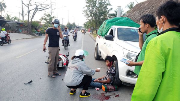 สมุทรสาคร-หนุ่ม16ขี่จยย.เฉี่ยวคนรถเสียหลักชนกระบะข้างทางเจ็บ ที่บริเวณหน้าร้านไก่ย่าง เยื้องปั๊มน้ำมันบางจาก ม.7 ต.สวนส้ม อ.เมือง จ.สมุทรสาคร
