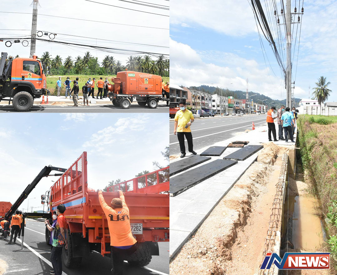 ปภ.พังงาป้องกันและแก้ปัญหาน้ำท่วมขัง ผิวจราจรถนนเพชรเกษม-หนองมูลตะกั่ว