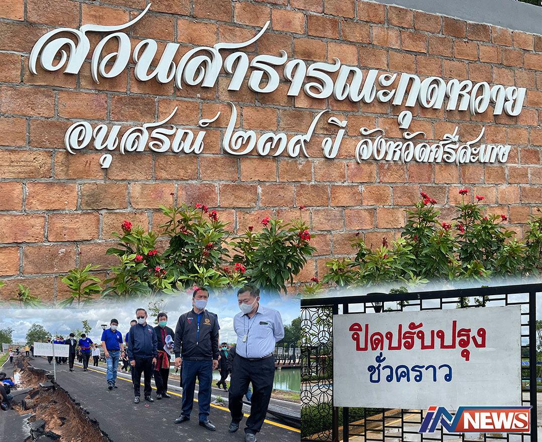 เมื่อวันที่ 20 พ.ค.2565 ที่บริเวณสวนสาธารณะกุดหวาย อนุสรณ์ 239 ปี จ.ศรีสะเกษ ถนนศรีสะเกษ-อุทุมพรพิสัย ต.หญ้าปล้อง อ.เมืองศรีสะเกษ นายทรงศักดิ์ ทองศรี รมช.กระทรวงมหาดไทย และคณะ ได้ลงพื้นที่ตรวจติดตามโครงการปรับปรุงสวนสาธารณะหนองกุดหวาย อ.เมืองศรีสะเกษ หลังจากที่มีข่าวทางสื่อสารมวลชนว่า เกิดแผ่นดินทรุดตัวบริเวณถนนลาดยาง ซึ่งก่อสร้างเป็นถนนสำหรับรถจักรยาน และเส้นทางวิ่งออกกำลังกายรอบหอขวัญเมืองศรี ภายในสวนสาธารณะดังกล่าว จนเป็นเหตุให้ไม่สามารถใช้การได้ สภาพถนนทรุดเป็นแนวยาวประมาณ 120 เมตร ลึกประมาณ 150-170 ซ.ม. อีกทั้งรั้วกำแพงคอนกรีตเสริมเหล็กยังแตกร้าวพังเป็นแถบเอนออกด้านนอกมีแนวโน้มว่าจะล้ม ซึ่งสวนสาธารณแห่งนี้เพิ่งมีการส่งมอบพื้นที่ให้เทศบาลเมืองศรีสะเกษ เป็นหน่วยงานรับผิดชอบในการบริหารจัดการปรับปรุงดูแลรักษา เมื่อวันที่ 15 ก.พ. 65ที่ผ่านมา โดยโครงการดังกล่าว จ.ศรีสะเกษ มอบหมายให้สำนักงานโยธาธิการและผังเมือง จ.ศรีสะเกษ เป็นผู้รับผิดชอบในการดำเนินงานโครงการพัฒนาการท่องเที่ยวแบบครบวงจร ได้รับงบประมาณในปี 63 ในการดำเนินงาน งบประมาณสูงถึง 140 ล้านบาท บนเนื้อที่กว่า 20 ไร่ โดย รมช.กระทรวงมหาดไทยและคณะ ได้ตรวจสอบบริเวณถนนตามที่เป็นข่าว ซึ่ง รมช.มหาดไทยได้พบว่า ถนนได้ทรุดตัวลึกเป็นทางยาว และบริเวณรั้วที่พังเป็นแถบ จนหวั่นเกรงว่า อาจจะเกิดอันตรายต่อประชาชนหากเข้ามาใช้บริเวณนี้ในการเดิน - วิ่งหรือปั่นรถจักรยานออกกำลังกาย ส่วนราชการที่เกี่ยวข้องได้ประกาศปิดสวนสาธารณะแห่งนี้เพื่อเตรียมทำการปรับปรุงแก้ไขแล้วโดยมี นายอนุรัตน์ ธรรมประจำจิต รอง ผวจ.ศรีสะเกษ พร้อมด้วย นายฉัฐมงคล อังคสกุลเกียรติ นายกเทศมนตรีเมืองศรีสะเกษ โยธาธิการและผังเมืองศรีสะเกษ และส่วนราชการที่เกี่ยวข้องมาร่วมในการตรวจสอบครั้งนี้