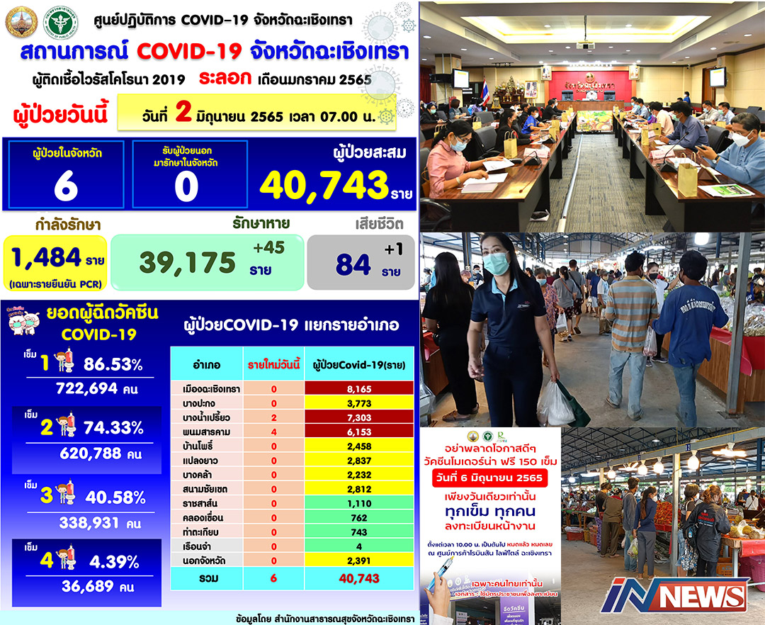 วันที่ 2 มิ.ย.65 เวลา 16.30 น. ผู้สื่อข่าวรายงานสถานการณ์การระบาดของโรคโควิด 19 ในพื้นที่ จ.ฉะเชิงเทรา ล่าสุดว่า ในวันนี้ตัวเลขของการตรวจพบผู้ติดเชื้อลดลงจากปกติเป็นอย่างมาก จนถึงระดับต่ำสุดในรอบกว่า 1 ปีที่ผ่านมา โดยมีการตรวจพบผู้ติดเชื้อเพียง 6 ราย ขณะที่สถิติการระบาดนับจากเมื่อช่วงต้นปี 2565 ที่ผ่านมา มีผู้ป่วยสะสมจำนวน 40,743 ราย เสียชีวิต 84 ราย