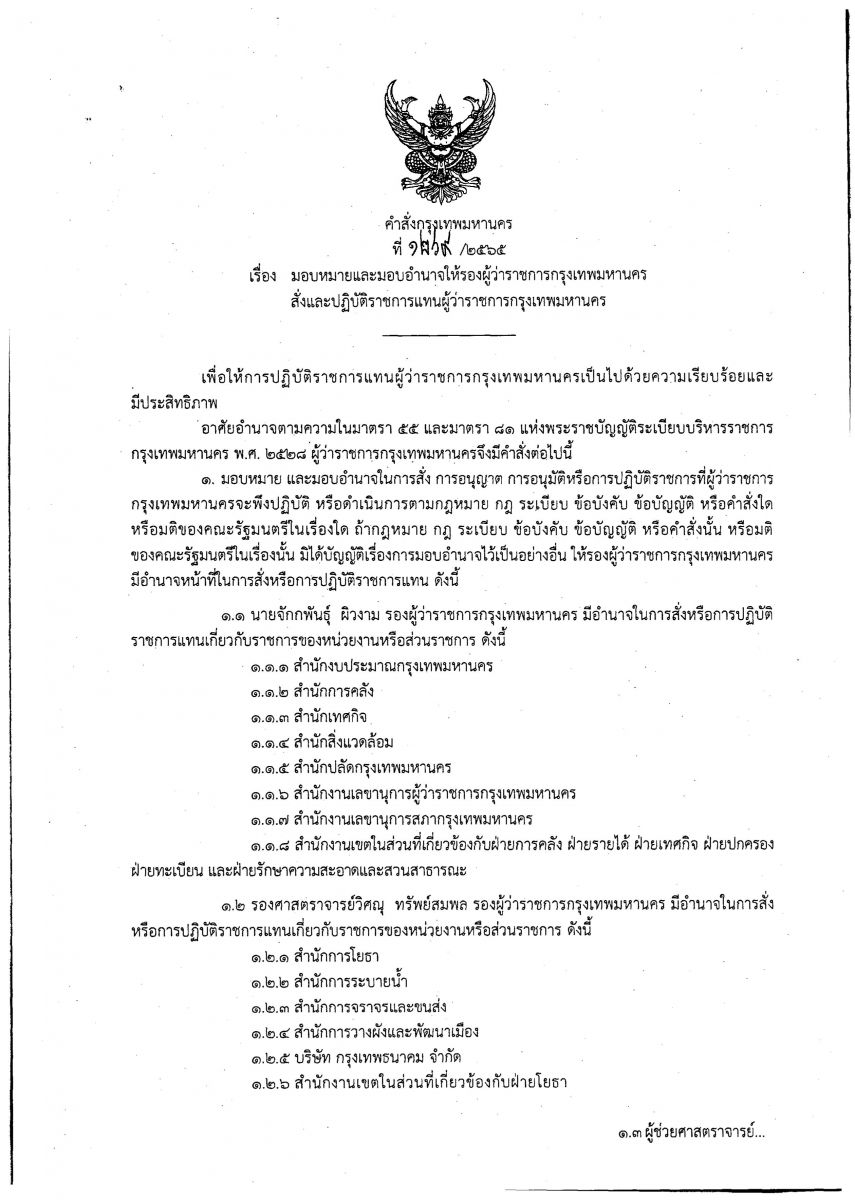 สำหรับสาระสำคัญในคำสั่งดังกล่าวประกอบด้วย ข้อ 1. มอบหมายและมอบอำนาจให้รองผู้ว่าราชการกรุงเทพมหานครมีอำนาจหน้าที่ในการสั่งหรือการปฏิบัติราชการแทนผู้ว่าราชการกรุงเทพมหานคร ดังนี้ 1.1 นายจักกพันธุ์ ผิวงาม มีอำนาจในการสั่งหรือการปฏิบัติราชการแทนเกี่ยวกับราชการของสำนักงบประมาณกรุงเทพมหานคร สำนักการคลัง สำนักเทศกิจ สำนักสิ่งแวดล้อม สำนักปลัดกรุงเทพมหานคร สำนักงานเลขานุการผู้ว่าราชการกรุงเทพมหานคร สำนักงานเลขานุการสภากรุงเทพมหานคร และสำนักงานเขตในส่วนที่เกี่ยวข้องกับฝ่ายการคลัง ฝ่ายรายได้ ฝ่ายเทศกิจ ฝ่ายปกครอง ฝ่ายทะเบียน และฝ่ายรักษาความสะอาดและสวนสาธารณะ 1.2 รศ.วิศณุ ทรัพย์สมพล มีอำนาจในการสั่งหรือการปฏิบัติราชการแทนเกี่ยวกับราชการของสำนักการโยธา สำนักการระบายน้ำ สำนักการจราจรและขนส่ง สำนักการวางผังและพัฒนาเมือง บริษัท กรุงเทพธนาคม จำกัด และสำนักงานเขตในส่วนที่เกี่ยวข้องกับฝ่ายโยธา 1.3 ผศ.ทวิดา กมลเวชช มีอำนาจในการสั่งหรือการปฏิบัติราชการแทนเกี่ยวกับราชการของสำนักการแพทย์ สำนักอนามัย สำนักยุทธศาสตร์และประเมินผล สำนักป้องกันและบรรเทาสาธารณภัย สำนักงานคณะกรรมการข้าราชการกรุงเทพมหานคร มหาวิทยาลัยนวมินทราธิราช และสำนักงานเขตในส่วนที่เกี่ยวข้องกับฝ่ายสิ่งแวดล้อมและสุขาภิบาล และ 1.4 นายศานนท์ หวังสร้างบุญ มีอำนาจในการสั่งหรือการปฏิบัติราชการแทนเกี่ยวกับราชการของสำนักการศึกษา สำนักพัฒนาสังคม สำนักวัฒนธรรม กีฬา และการท่องเที่ยว การพาณิชย์ของกรุงเทพมหานคร และสำนักงานเขตในส่วนที่เกี่ยวข้องกับฝ่ายการศึกษาและโรงเรียนในสังกัดกรุงเทพมหานคร และฝ่ายพัฒนาชุมชนและสวัสดิการสังคม