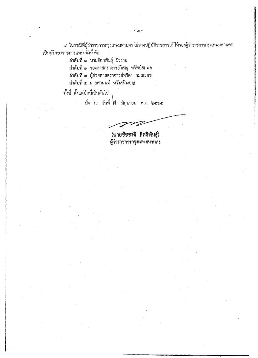 (2 มิ.ย. 65) นายชัชชาติ สิทธิพันธุ์ ผู้ว่าราชการกรุงเทพมหานคร ลงนามในคำสั่งกรุงเทพมหานคร ที่ 1269/2565 เรื่อง มอบหมายและมอบอำนาจให้รองผู้ว่าราชการกรุงเทพมหานครสั่งและปฏิบัติราชการแทนผู้ว่าราชการกรุงเทพมหานคร ซึ่งมีผลตั้งแต่บัดนี้เป็นต้นไป