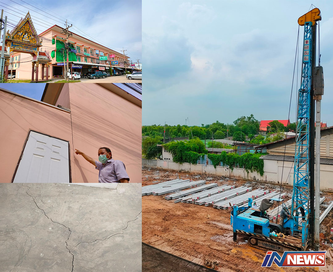 ตั้งแต่เมื่อวันที่ 2 มิ.ย.65 เป็นต้นมาได้มีบริษัทเอกชนรายนี้ เข้ามาทำการปรับพื้นที่และตอกเสาเข็มก่อสร้างโกดังเก็บสินค้าบนแปลงที่ดินประมาณ 1 ไร่ ซึ่งเป็นพื้นที่ติดกันกับด้านหลังอาคารพาณิชย์สูง 3 ชั้นจำนวน 18 คูหาของชาวบ้าน เนื่องจากหลังบริษัทดังกล่าวได้เข้ามาดำเนินการตอกเสาเข็มเพื่อเตรียมการก่อสร้างโกดังเก็บสินค้ามากว่าครึ่งเดือน ได้ทำให้อาคารพาณิชย์ที่ตั้งอยูเรียบแนวถนนสาย 304 แตกร้าวไปทั่วเกือบทุกคูหา