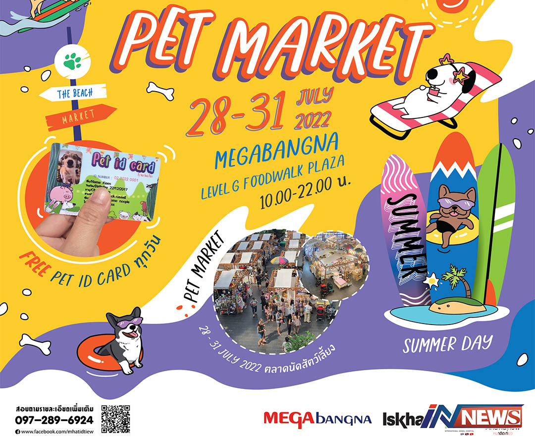 งานนี้ Pet Lover พลาดไม่ได้! กับงาน “PET MARKET”ระหว่างวันพฤหัสบดีที่ 28 – วันอาทิตย์ที่ 31 กรกฎาคม 2565 ณ บริเวณฟู้ดวอล์ค พลาซ่า ชั้น G ศูนย์การค้าเมกาบางนา