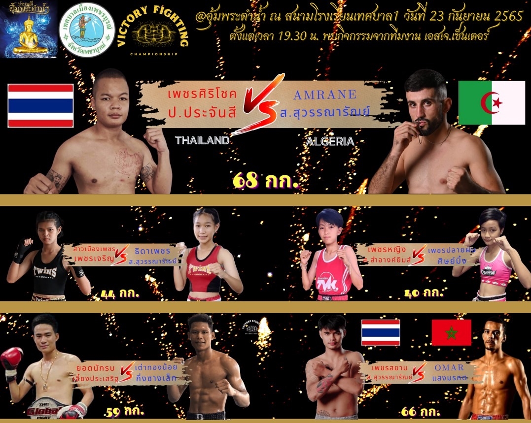 สำหรับการจัดการแข่งขันชกมวยไทยในครั้งนี้ มีนักชกชาวไทย เพชรศิริโชค ป.ประจันสี V.S. AMRANE ส.สุวรรณารัณย์ นักชกต่างชาติชาว ALGERIA นอกจากนี้ยังมีนักมวยทั้งชาย และนักมวยหญิง จากค่ายมวยเพชรเจริญ เพชรบูรณ์ ที่จะขึ้นเวทีชกในงานนี้อีก 10 คู่ด้วยกัน ณ บริเวณสนามโรงเรียนเทศบาล 1 (บ้านในเมือง) ต.ในเมือง อ.เมือง จ.เพชรบูรณ์ ในวันที่ 23 กันยายน 2565 ตั้งแต่เวลา 19.30 – 23.30 น.วันแรกของงาน เพื่ออนุรักษ์ขนบธรรมเนียมประเพณีอันดีงามของชาวจังหวัดเพชรบูรณ์