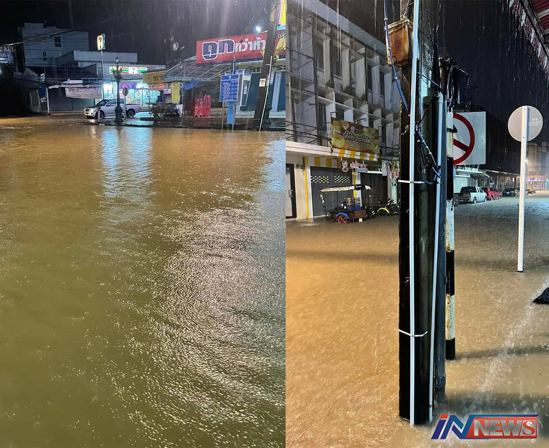 อ่วม!ฝนตกหนักทั้งคืนน้ำเอ่อย่านการค้า ถนนในเขตเทศบาลเมืองกลายเป็นคลอง