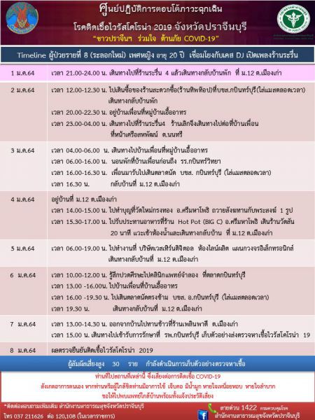 7 ม.ค.64 เวลา 13.00-14.30 น. ออกจากบ้านไปทานข้าวที่ร้านเพลินพาดี ต.เมืองเก่า เวลา 15.00 น. เดินทางไปเข้ารับการรักษาที่ รพ.กบินทร์บุรี เก็บตัวอย่างส่งตรวจหาเชื้อไวรัสโคโรน่า 19