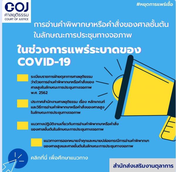 เมื่อวันที่ 11 ม.ค.64 นายสุริยัณห์ หงษ์วิไล โฆษกศาลยุติธรรม กล่าวถึงการบริหารจัดการของศาลยุติธรรมและสำนักงานศาลยุติธรรม เพื่อลดความเสี่ยงในช่วงการแพร่ระบาดของเชื้อไวรัสโควิด-19 (COVID-19) ระลอกใหม่นี้ว่า ศาลยุติธรรมและสำนักงานศาลยุติธรรม ตระหนักถึงความเข้มงวดในการเฝ้าระวังและการป้องกันผ่านการวางมาตรการต่างๆ ลักษณะตั้งการ์ดแบบไม่มีตก ซึ่งได้ศึกษาและหารือกันมาแล้วโดยคณะอนุกรรมการศึกษา ติดตามและแก้ไขการบริหารจัดการคดีภายใต้สถานการณ์แพร่ระบาดของโรคติดเชื้อไวรัสโคโรนา 2019 ที่มีนางเมทินี ชโลธร ประธานศาลฎีกา เป็นประธานอนุกรรมการฯ ซึ่งได้กำหนดแนวทางการบริหารจัดคดีไว้ต่อเนื่องตามสถานการณ์ที่เกิดขึ้นในปัจจุบัน รวมทั้งเกาะติดสถานการณ์ เพื่อไม่ให้เกิดผลกระทบกับคู่ความและประชาชนที่ต้องติดต่อราชการศาล โดยแนวทางการบริหารจัดคดีที่เราเน้นย้ำ คือ การสร้างความสะดวกและรวดเร็วให้แก่คู่ความที่จำเป็นต้องลดหรืองดการเดินทางไปในที่สาธารณะเพื่อลดความเสี่ยงการสัมผัสช่วงเชื้อโควิดกำลังระบาด ซึ่งเรามีแนวทางการใช้นวัตกรรมด้วยเทคโนโลยีออนไลน์ เช่น วิดีโอคอนเฟอเรนซ์ หรือการประชุมทางไกลผ่านจอภาพ (VDO Conference) แอปพลิเคชั่นไลน์ (LINE) , แอปพลิเคชั่น ZOOM (ซูม) หรือการประชุมออนไลน์ทางไกลผ่านสมาร์ทโฟนหรือคอมพิวเตอร์ เป็นต้น