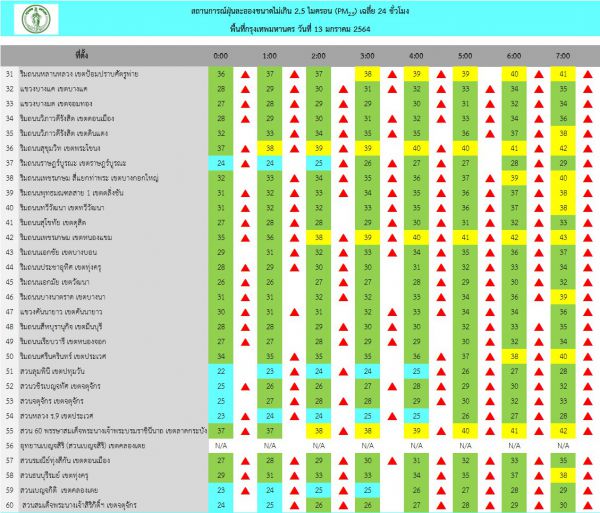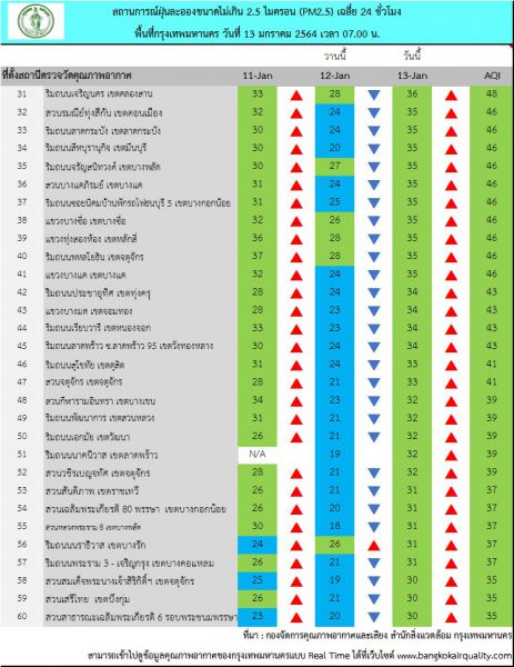ศูนย์ประสานงานและแก้ไขปัญหามลพิษทางอากาศในกรุงเทพมหานครขอรายงานสถานการณ์ฝุ่นละอองขนาดไม่เกิน 2.5 ไมครอน (PM 2.5) ของสถานีตรวจวัดคุณภาพอากาศของกรุงเทพมหานคร