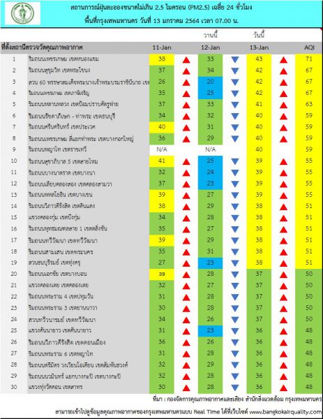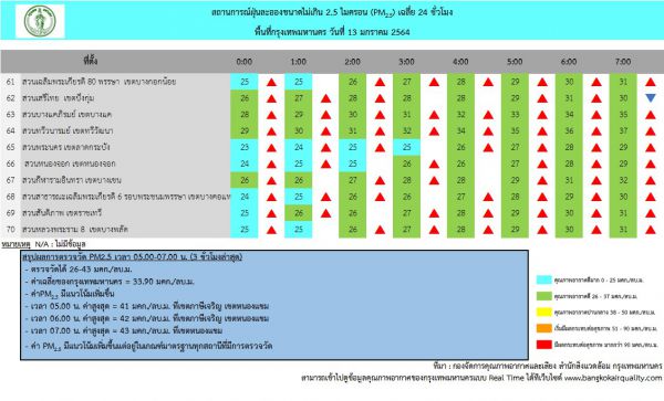 ศูนย์ประสานงานและแก้ไขปัญหามลพิษทางอากาศของกรุงเทพมหานครขอสรุปผลการตรวจวัด PM2.5 เวลา 05.00-07.00น. (3 ชั่วโมงล่าสุด)