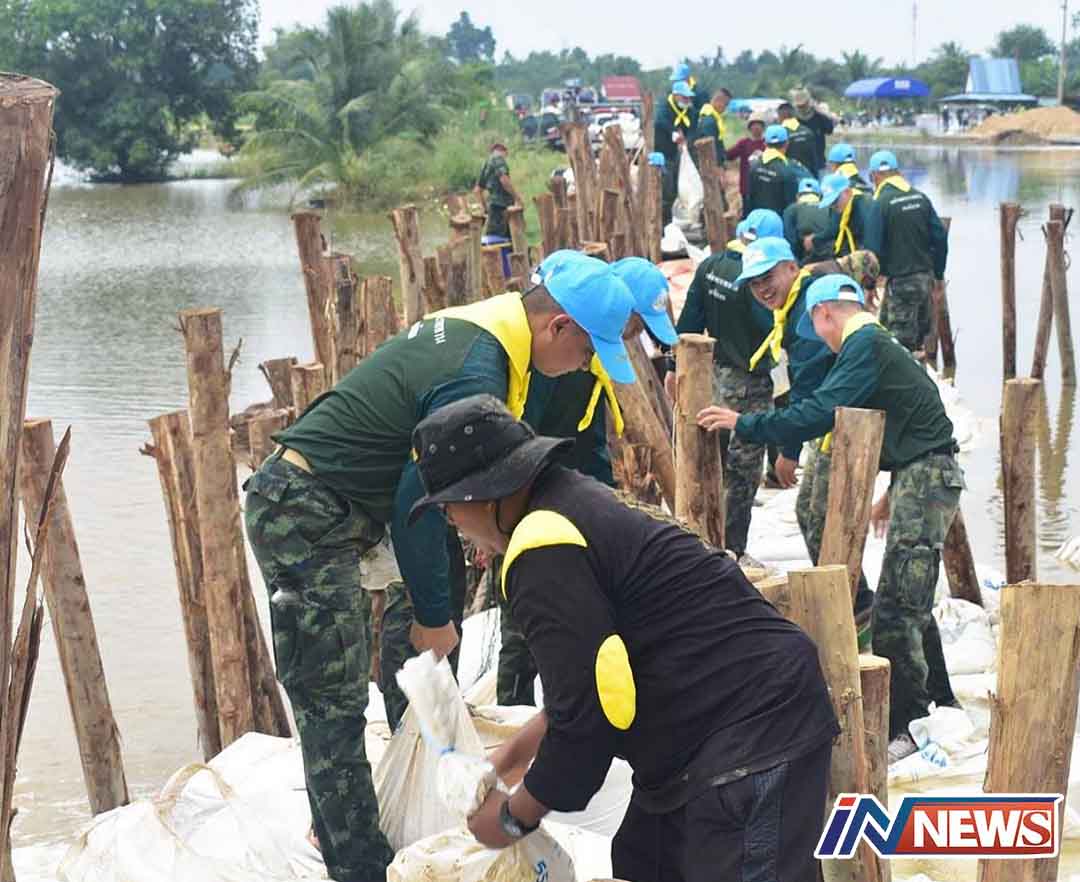 กองทับจัดกำลังพลช่วยเหลือซ่อมแซมคันกั้นน้ำที่ชำรุดรอยต่อลพบุรีสิงห์บุรี