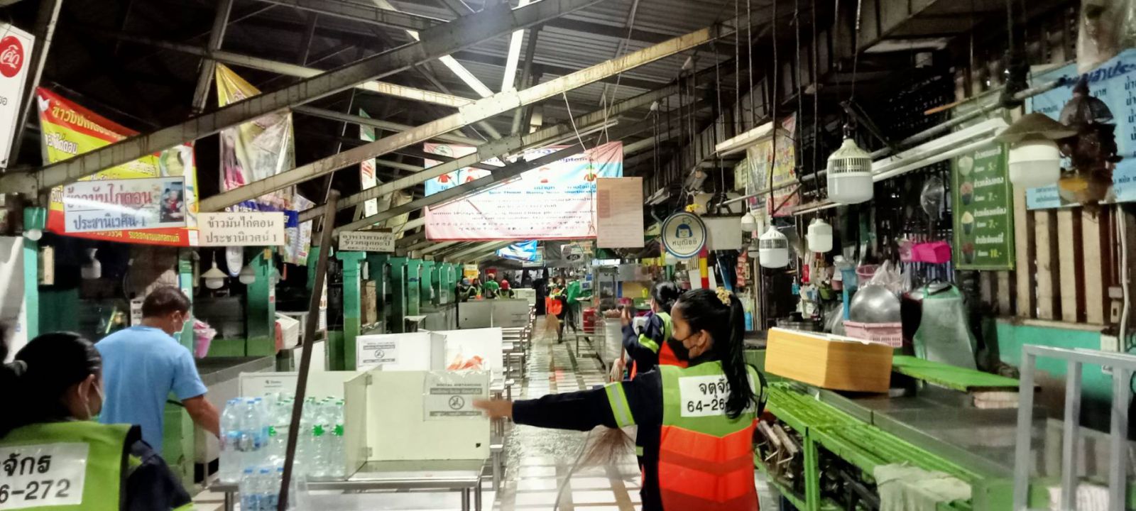 นางสาวสมฤดี จันทรพิทักษ์ รองผู้อำนวยการสำนักงานตลาดกรุงเทพมหานคร รักษาการผู้อำนวยการสำนักงานตลาดกรุงเทพมหานคร กล่าวว่า สำนักงานตลาดกรุงเทพมหานคร ได้เข้มงวดตลาดในกำกับดูแลทั้ง 12 แห่ง ให้ปฏิบัติตามมาตรการควบคุมการแพร่ระบาดของโรคโควิด 19 อย่างเคร่งครัด ทั้งผู้ค้าและผู้มาใช้บริการ มีการจัดจุดคัดกรองเข้า-ออก ชัดเจน ติดตั้งอ่างล้างมือและเจลล้างมือ กำหนดจุดเว้นระยะห่าง จัดทำฉากกั้นทุกโต๊ะภายในศูนย์อาหาร ทำความสะอาดจุดสัมผัสร่วมและห้องสุขาทุกวัน ล้างตลาดเป็นประจำทุกสัปดาห์ รวมทั้งฉีดพ่นยาฆ่าเชื้อบริเวณแผงค้า พื้นทางเดิน รางระบายน้ำ พื้นถนนโดยรอบตลาด ห้องสุขาและจุดพักขยะ ขณะเดียวกันได้นำผู้ให้บริการทั้งผู้ค้าและผู้ช่วยขาย ทั้งที่เป็นคนไทยและแรงงานต่างด้าวในตลาด กทม.เข้ารับการฉีดวัคซีนโควิด 19 รวมทั้งเน้นย้ำผู้ค้า ผู้ช่วยขาย และแรงงานต่างด้าวสวมหน้ากากอนามัยตลอดเวลาที่ทำการค้าภายในตลาด และทำความสะอาดแผงค้าหลังเลิกทำการค้าทุกวัน นอกจากนั้น ยังร่วมกับศูนย์บริการสาธารณสุขและสำนักงานเขตที่ตลาดแต่ละแห่งตั้งอยู่ในพื้นที่จัดหน่วยเคลื่อนที่ให้บริการตรวจโควิด 19 เชิงรุกโดยไม่เสียค่าใช้จ่าย โดยตรวจแบบ RT- PCR และ ATK เป็นระยะ เพื่อสร้างความเชื่อมั่นให้ผู้มาใช้บริการ ตลอดจนกำชับผู้ขายและผู้เกี่ยวข้องให้คัดกรองความเสี่ยงก่อนเข้าตลาด ด้วยการสแกนผ่านแอปพลิเคชัน “ไทยเซฟไทย” เพื่อความปลอดภัยและคัดกรองความเสี่ยงในระยะยาว
