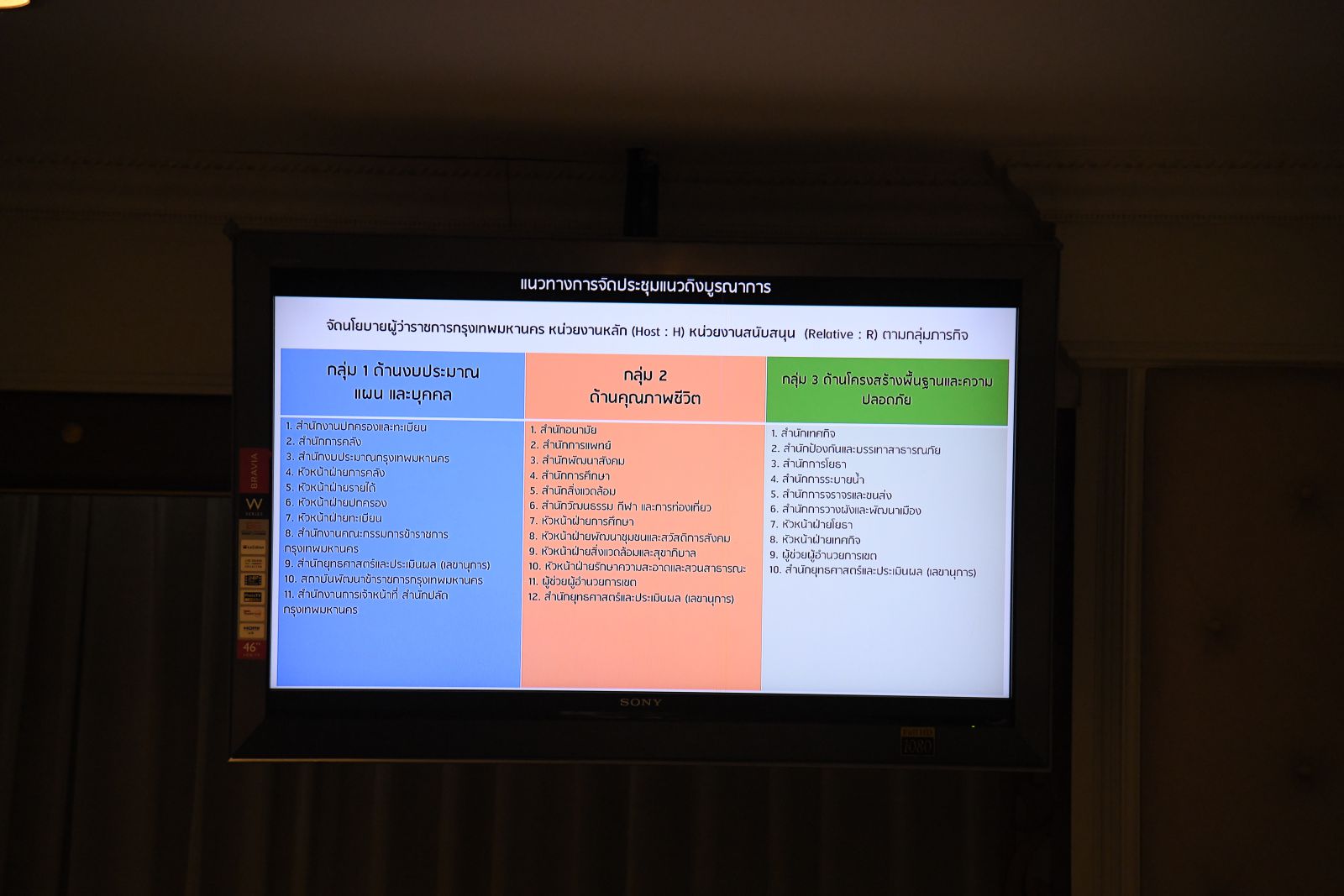 ประธานที่ปรึกษาฯ กล่าวภายหลังการประชุมว่า วันนี้เป็นการประชุมหลังจากที่เราได้จัดแนวทางบริหารออกเป็นกลุ่มภารกิจ ซึ่งสิ่งสำคัญที่สุดของกรุงเทพมหานครคือการเชื่อมโยงแนวนโยบายระหว่างสำนักและสำนักงานเขต โดยแต่เดิมนั้นงานของกรุงเทพมหานครจะอยู่ในลักษณะเป็นกล่อง แบบกล่องใครกล่องมัน แต่วันนี้เราได้ทลายกล่องระหว่างสำนักกับเขตโดยกระบวนการประชุมแนวดิ่ง เพื่อเชื่อมโยงภารกิจหลายอย่างที่เคยแยกจากกัน เช่น เรื่องคลอง สำนักการระบายน้ำดูแล 213 คลอง สำนักงานเขตต่าง ๆ ดูแล 948 คลอง ท่อระบายน้ำกว่า 6,000 กิโลเมตร สำนักการระบายน้ำดูแล 2,000 กิโลเมตร อีกกว่า 4,000 กิโลเมตร สำนักงานเขตดูแล ซึ่งที่ผ่านมาต่างคนต่างทำ ต่างคนต่างใช้งบประมาณ วันนี้เราบูรณาการเชื่อมกันเพื่อให้สำนักกับเขตเกิดความเข้าใจร่วมกัน ผ่านตัวชี้วัด BMA Digtal Plans ซึ่งสำนักยุทธศาสตร์และประเมินผลเป็นผู้จัดทำระบบขึ้นมา โดยใช้เป้าหมายความสำเร็จเป็นตัวหลัก มุ่งเน้นเพื่อประชาชนเป็นหลัก ทั้งนี้ การบูรณาการตามกลุ่มภารกิจจะทำให้เขตและสำนักมีเป้าหมายเดียวกัน เห็นภาพรวมเท่ากันและเห็นว่าการดำเนินการของแต่ละหน่วยงานมีผลต่อภาพรวมอย่างไร ซึ่งจะทำให้ทุกหน่วยงานทำงานได้ง่ายขึ้นเพราะมีเป้าหมายที่ชัดเจนและเป็นไปในทิศทางเดียวกัน